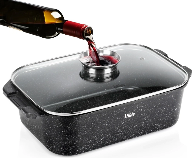 Zintegrowany dozownik pozwala dolewać wodę, wino lub marynatę bez podnoszenia pokrywy – mięso pozostaje soczyste, a piekarnik nie traci ciepła.