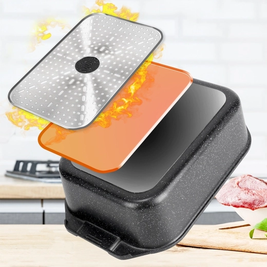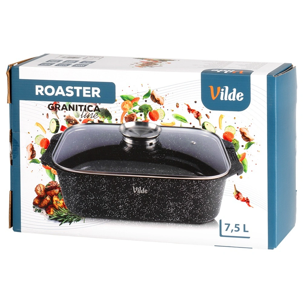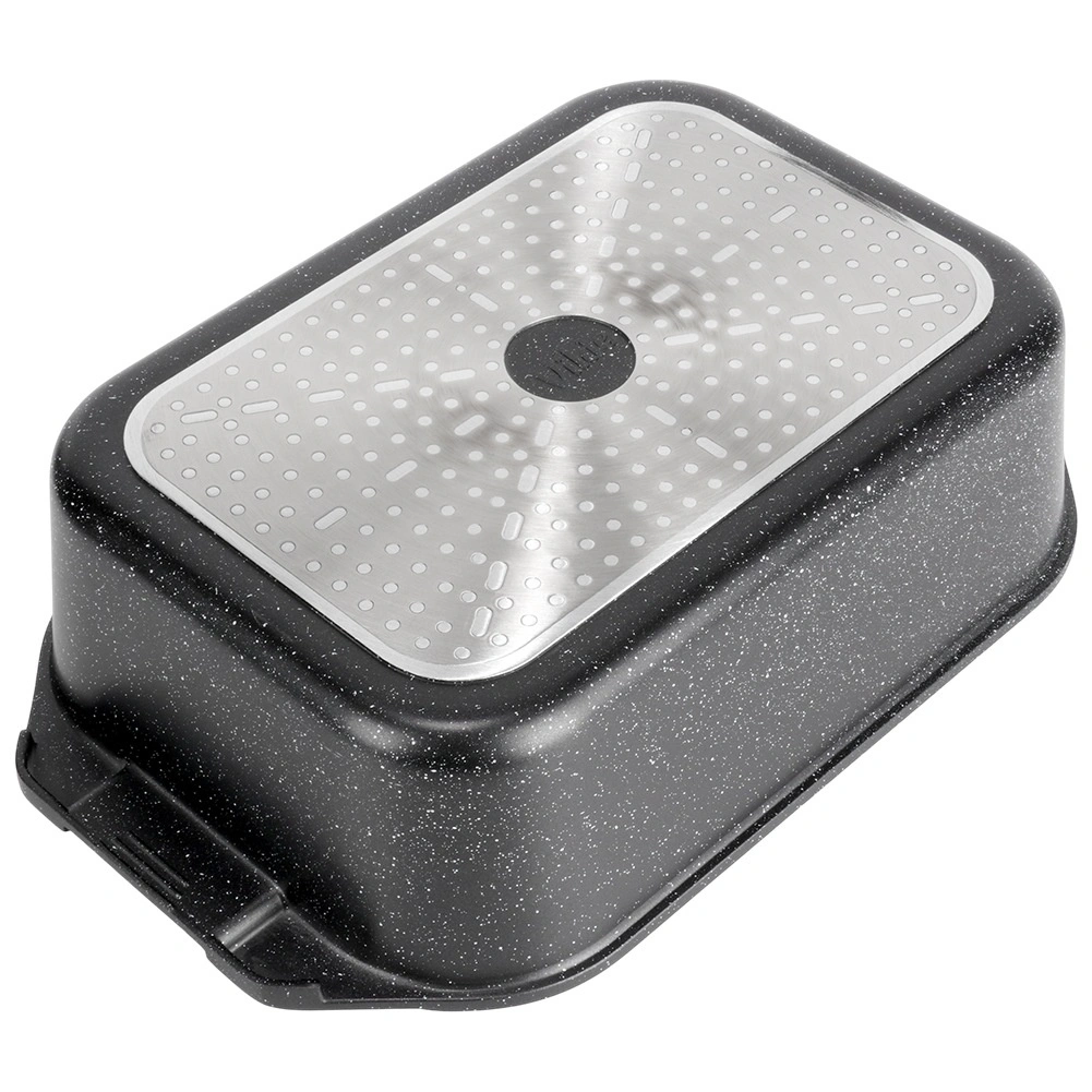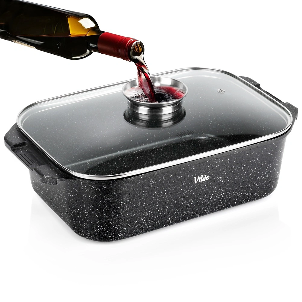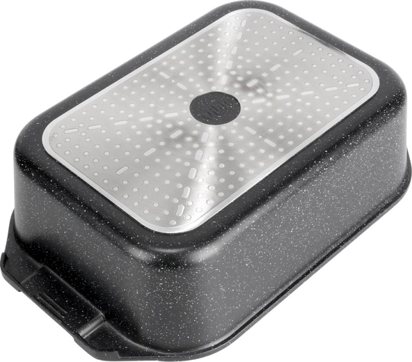 Pojemna granitowa brytfanna o objętości 7,5 l z żaroodporną szklaną pokrywą jest idealna do pieczenia, duszenia i zapiekania. Wytrzymałe, odlewane aluminiowe korpus z nieprzywierającą powłoką granitową pozwala gotować z minimalną ilością tłuszczu, doskonale akumuluje ciepło i dłużej utrzymuje potrawy ciepłe. Pokrywa z zintegrowanym dozownikiem umożliwia dolewanie wody, wina lub płynnych przypraw bez podnoszenia.