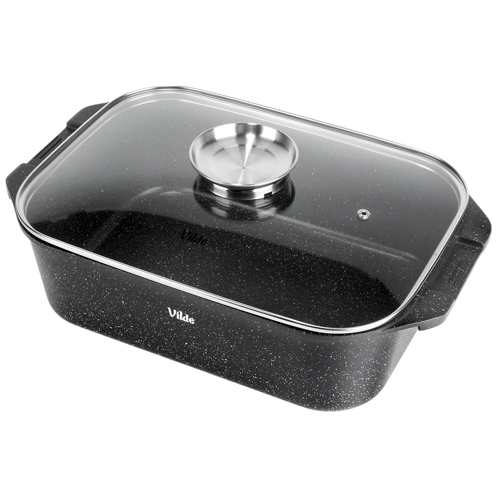 Uniwersalna brytfanna o wymiarach 41 × 26 × 16 cm (wysokość naczynia bez pokrywy 11 cm) to niezawodny pomocnik do codziennego gotowania. Solidny odlew aluminium z nieprzywierającą warstwą granitową zapewnia równomierne rozprowadzanie ciepła i łatwe wyjmowanie potraw. Szklana pokrywa jest żaroodporna i umożliwia wygodną kontrolę procesu przygotowania.