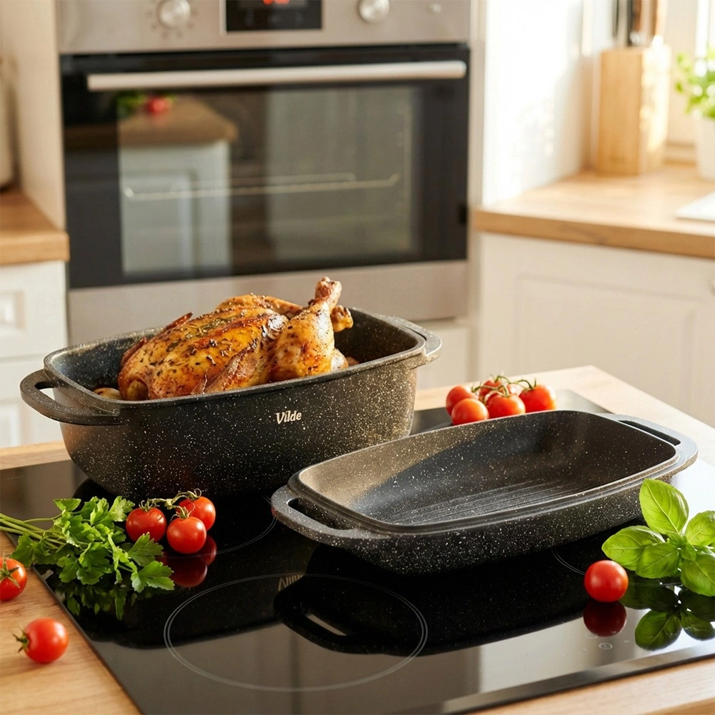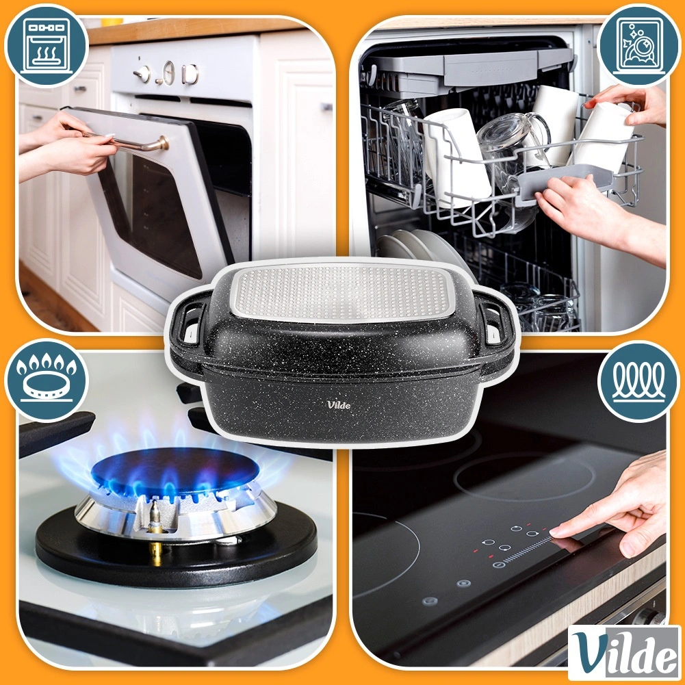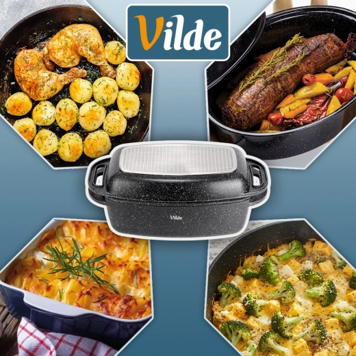 Wszechstronne zastosowanie: piekarnik do 250 °C, kuchenka gazowa, elektryczna, ceramiczna oraz indukcyjna. Po gotowaniu wystarczy włożyć do zmywarki. Oryginalny produkt VILDE – Granitica Line, wykonany zgodnie z europejskimi standardami.