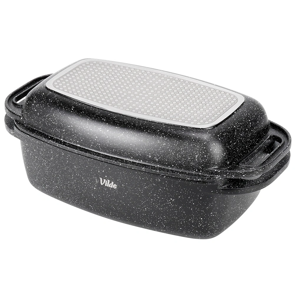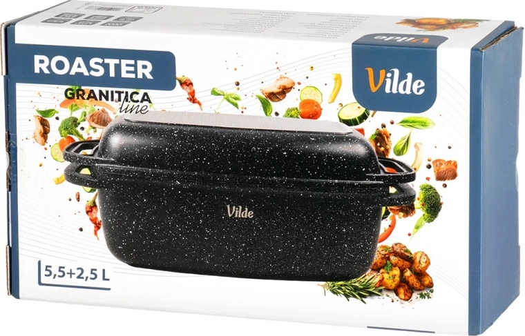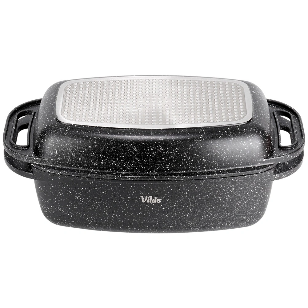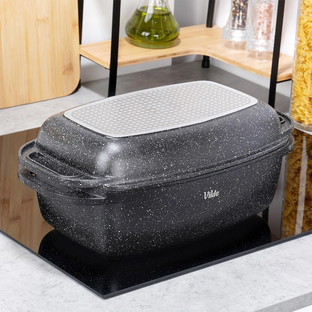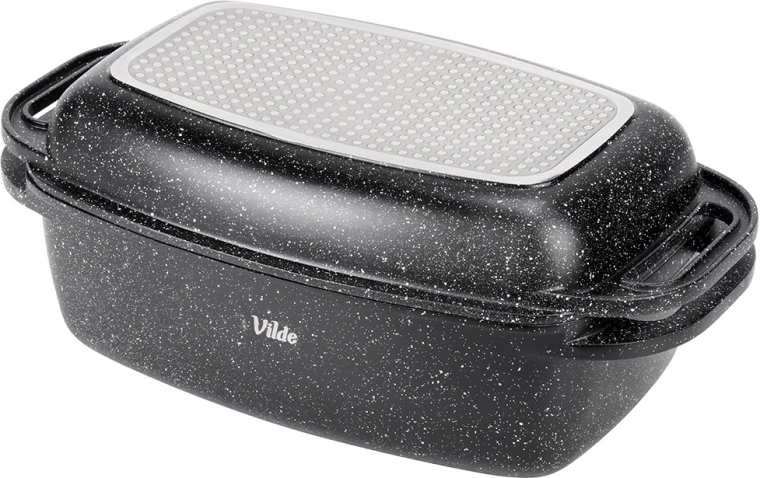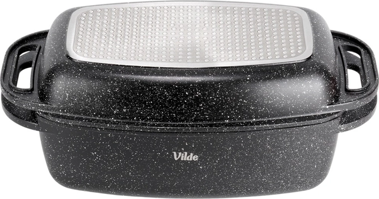 Praktyczna granitowa brytfanna z pokrywą 2w1 do pieczenia, duszenia i zapiekania. Pokrywa służy także jako samodzielna patelnia/grill. Odlew aluminiowy z nieprzywierającą powłoką granitową, dno indukcyjne oraz bezpieczne uchwyty dla łatwej manipulacji. Pojemność 5,5 l + 2,5 l, wymiary 40 × 22,5 cm, odporność do 250 °C, odpowiednia do piekarnika i na wszystkie typy kuchenek oraz do zmywarki. VILDE Granitica.