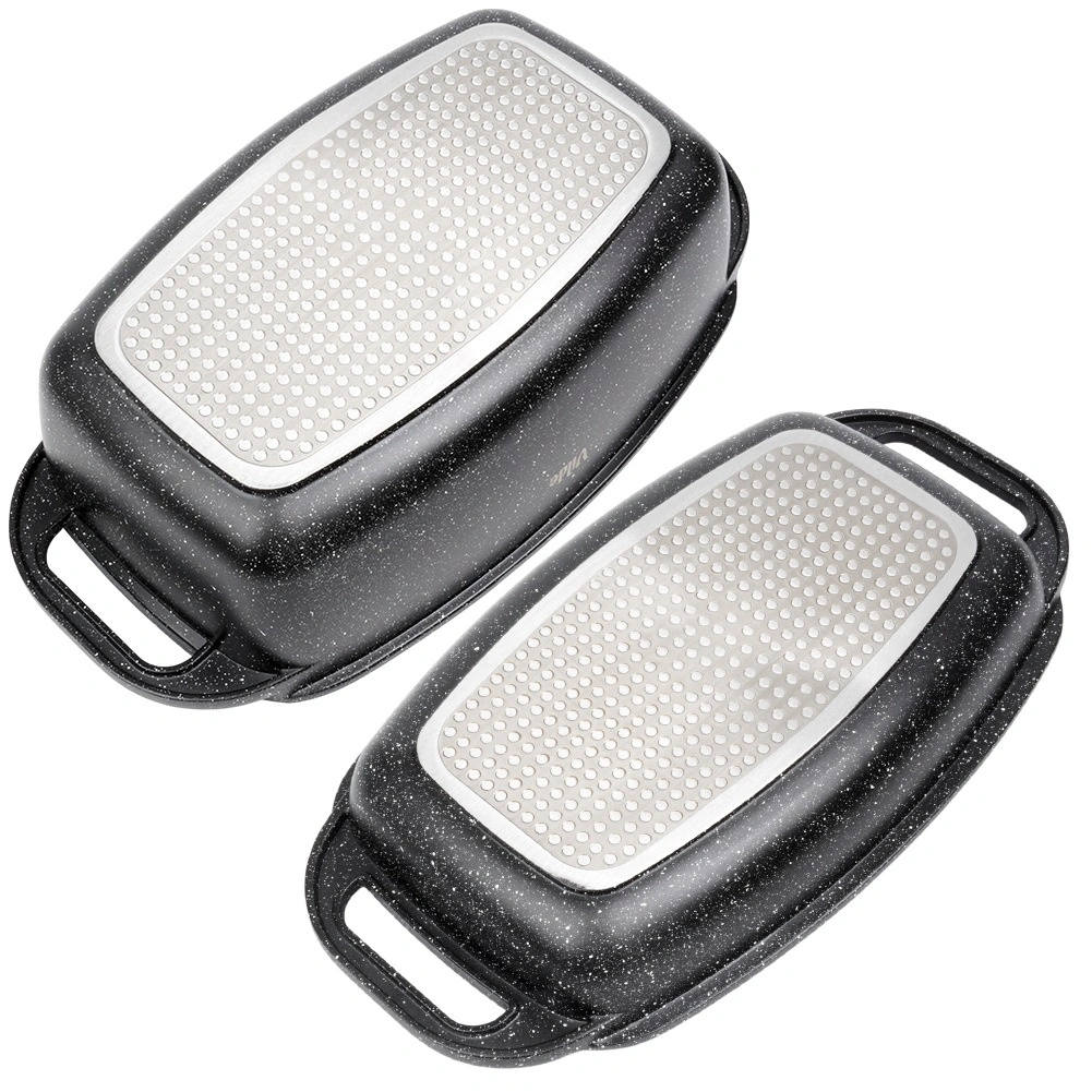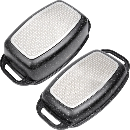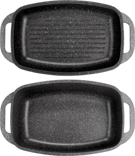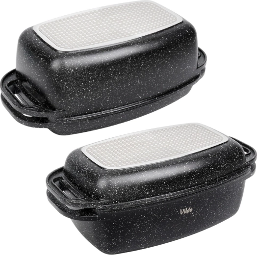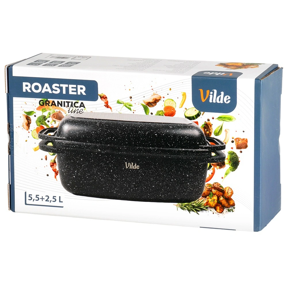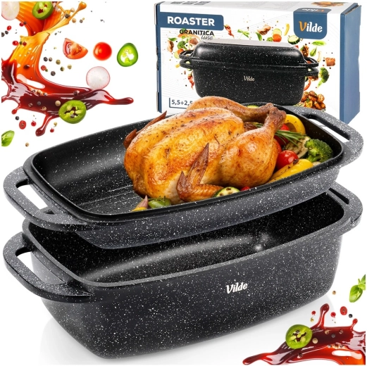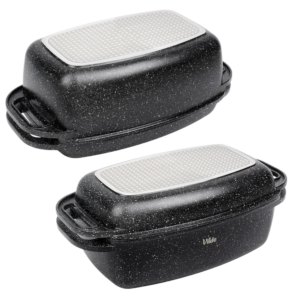 Praktyczna granitowa brytfanna z pokrywą 2w1 do pieczenia, duszenia i zapiekania. Pokrywa służy także jako samodzielna patelnia/grill. Odlew aluminiowy z nieprzywierającą powłoką granitową, dno indukcyjne oraz bezpieczne uchwyty dla łatwej manipulacji. Pojemność 5,5 l + 2,5 l, wymiary 40 × 22,5 cm, odporność do 250 °C, odpowiednia do piekarnika i na wszystkie typy kuchenek oraz do zmywarki. VILDE Granitica.