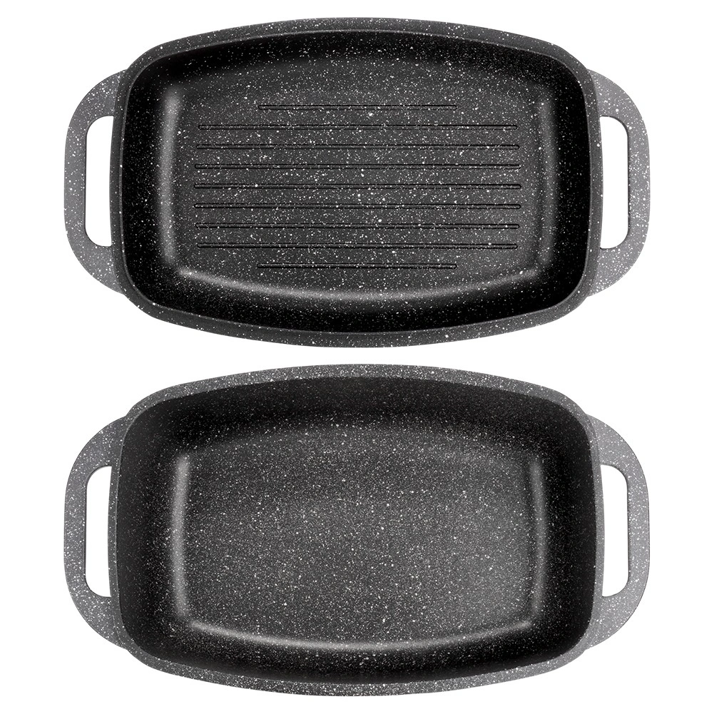 Brytfanna wykonana jest z trwałego odlewu aluminiowego z nieprzywierającą warstwą granitową, która umożliwia gotowanie z minimalną ilością oleju i łatwe czyszczenie. Materiał doskonale akumuluje ciepło, dzięki czemu potrawy dłużej pozostają ciepłe i równomiernie upieczone. Ergonomiczne uchwyty w obu częściach zapewniają bezpieczne przenoszenie.