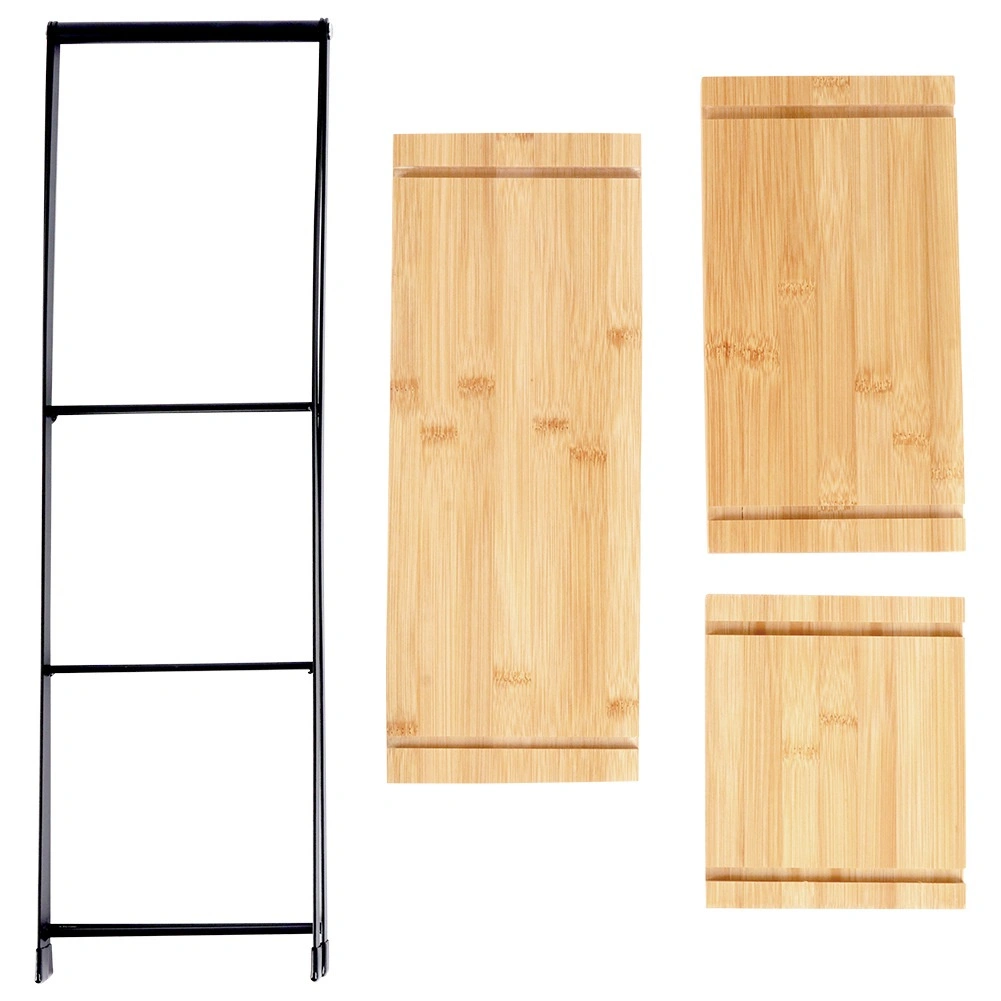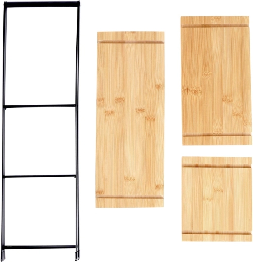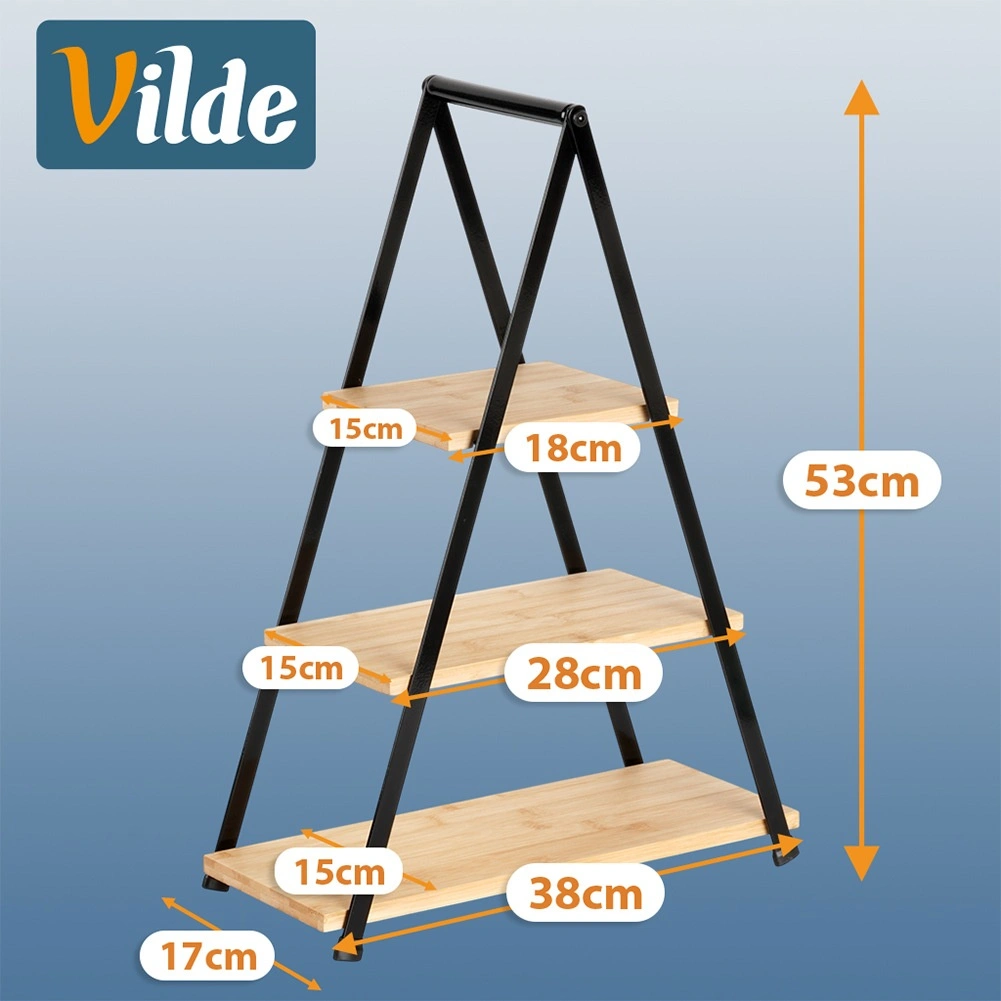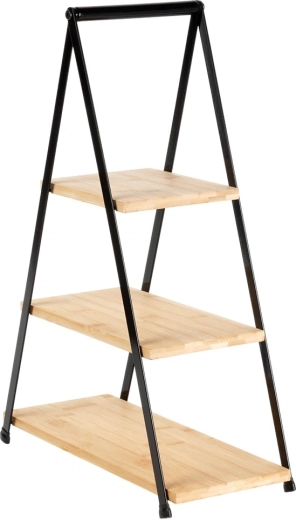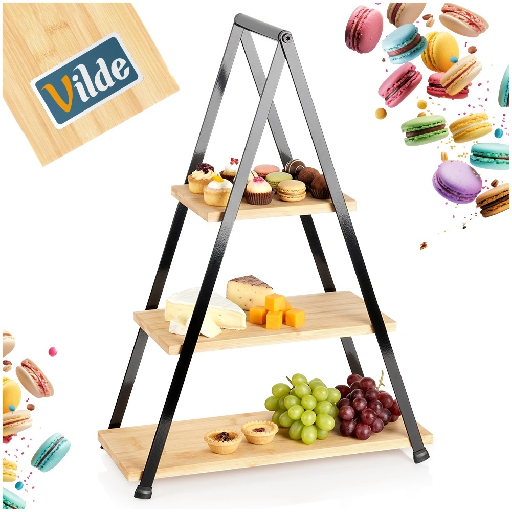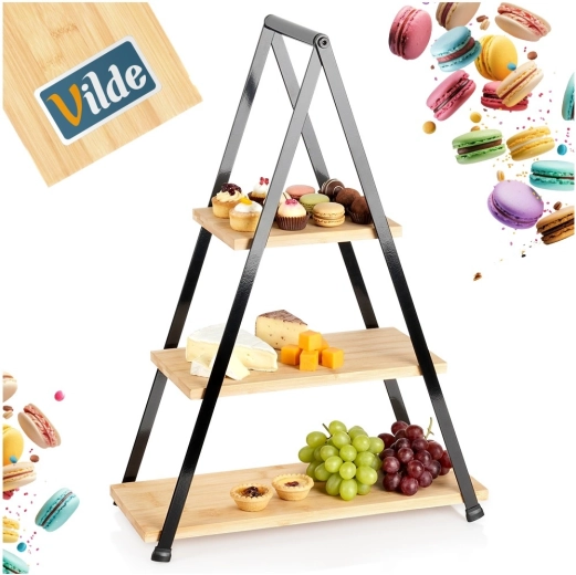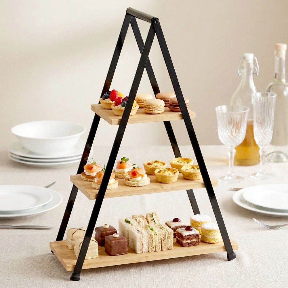 Wykonana z drewna bambusowego z metalowym mocowaniem w czarnym kolorze, etażerka jest trwała, łatwa w czyszczeniu i świetnie komponuje się zarówno z nowoczesnym, jak i naturalnym stylem nakrycia stołu. Sprawdzi się w domu i gastronomii do eleganckiej prezentacji babeczek, ciasteczek, serów, owoców czy słonych przekąsek.