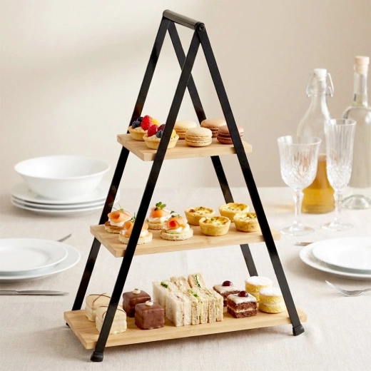 Ta designerska etażerka nada Twojemu serwowaniu profesjonalny charakter. Trzy wyjmowane prostokątne tace w różnych rozmiarach umożliwiają przejrzyste i efektowne ułożenie smakołyków na przyjęcia, wesela, słodkie stoły i rodzinne uroczystości. Stabilna rama w kształcie A z antypoślizgowymi nóżkami oraz praktyczny uchwyt ułatwiają bezpieczne przenoszenie.