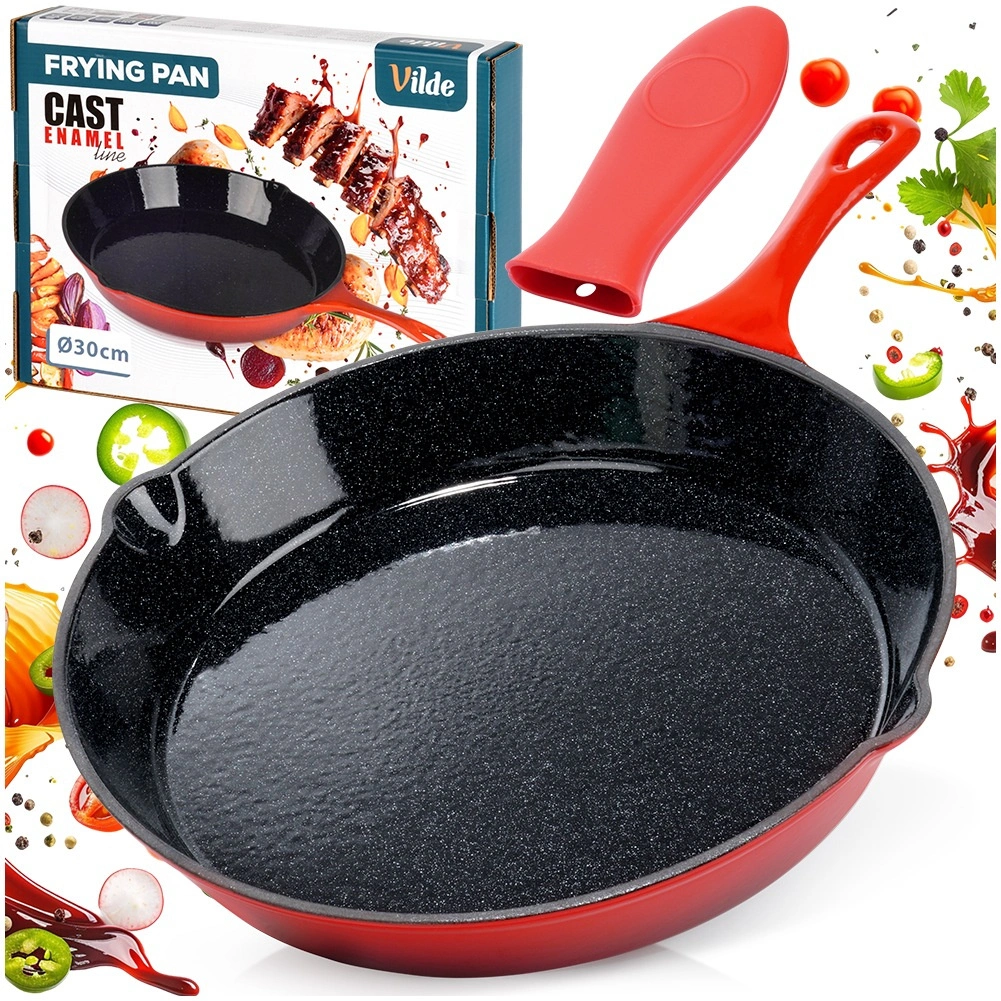 Uniwersalna żeliwna patelnia o średnicy 20 cm z czarną emaliowaną powłoką wewnątrz i czerwoną emalią na zewnątrz zapewnia szybkie i równomierne nagrzewanie, długie utrzymywanie ciepła oraz dwa praktyczne dzióbki do łatwego zlewania. W zestawie silikonowa nakładka na uchwyt dla bezpiecznej manipulacji. Odpowiednia na gaz, elektryczność, ceramikę i indukcję oraz do piekarnika.