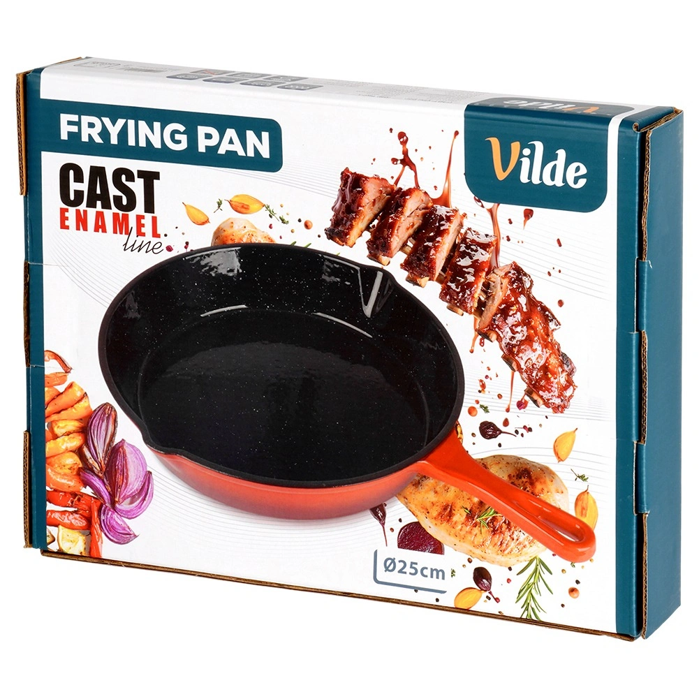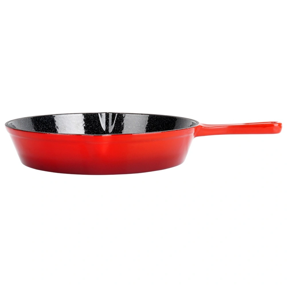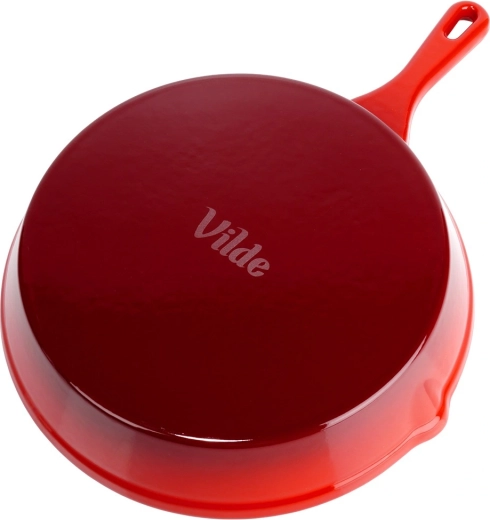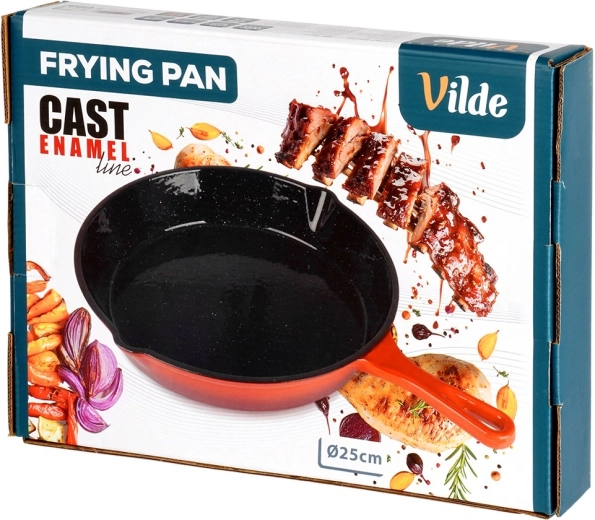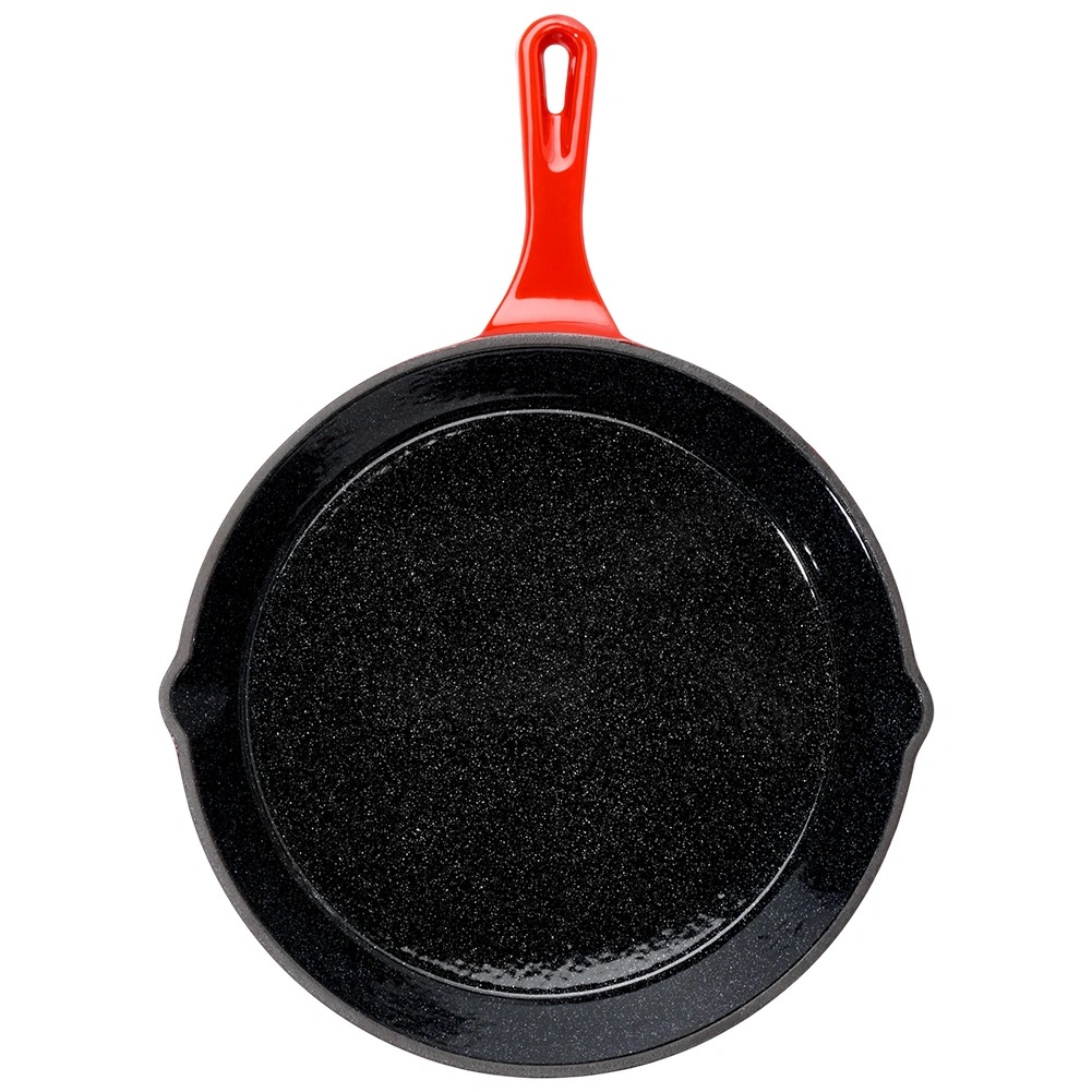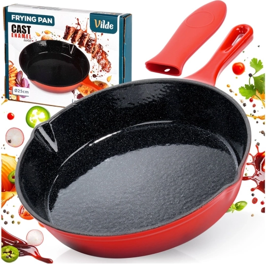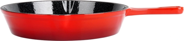 Solidna żeliwna patelnia o średnicy 25 cm z czarną nieprzywierającą, emaliowaną powłoką wewnętrzną i czerwonym wykończeniem zewnętrznym. Zapewnia równomierne rozprowadzanie ciepła, długie utrzymanie temperatury i nadaje się na gaz, kuchenkę elektryczną, ceramiczną oraz indukcję, do piekarnika i na grill. W zestawie silikonowa nakładka na uchwyt dla bezpiecznego przenoszenia oraz dwa dziobki do przelewania dla łatwego serwowania.