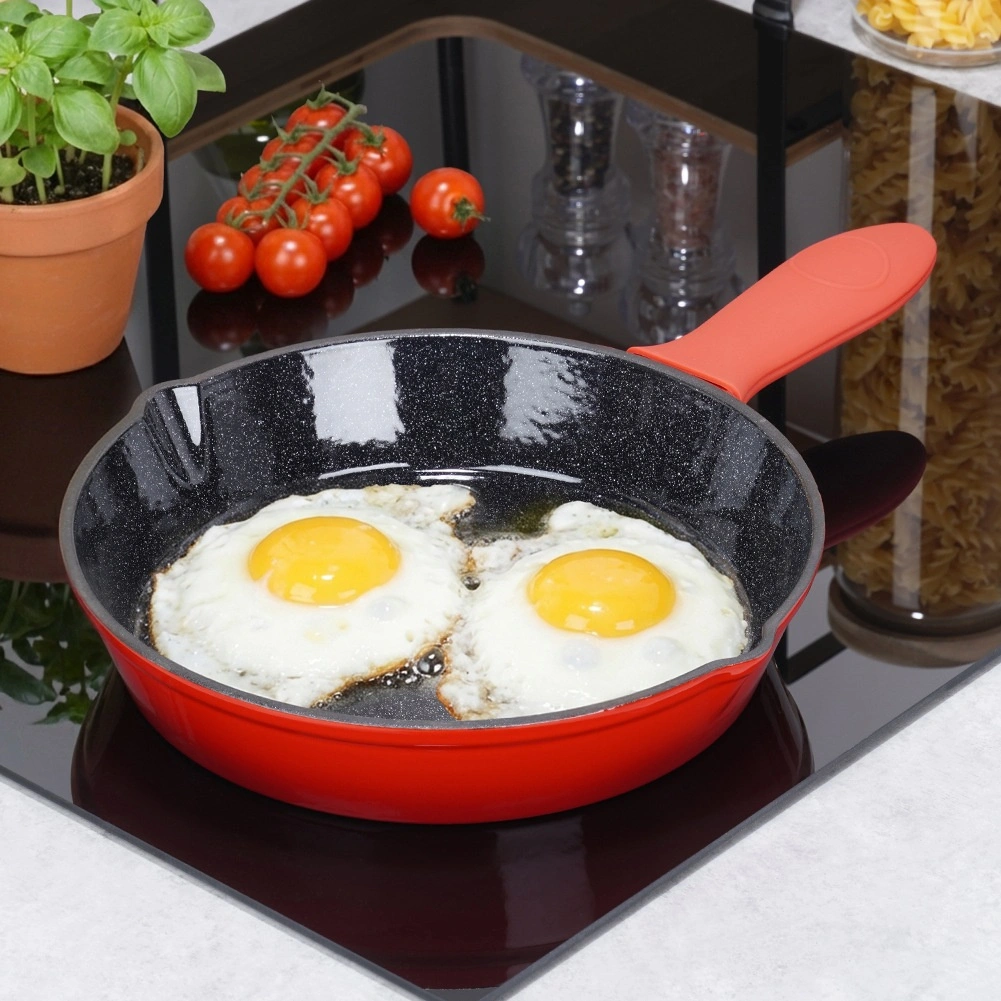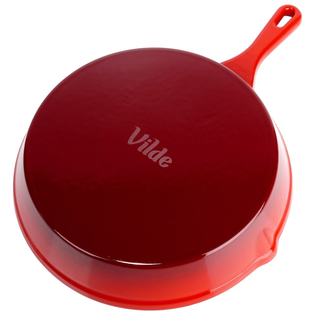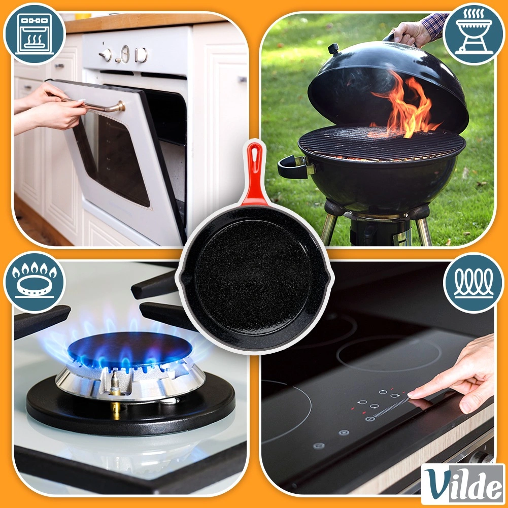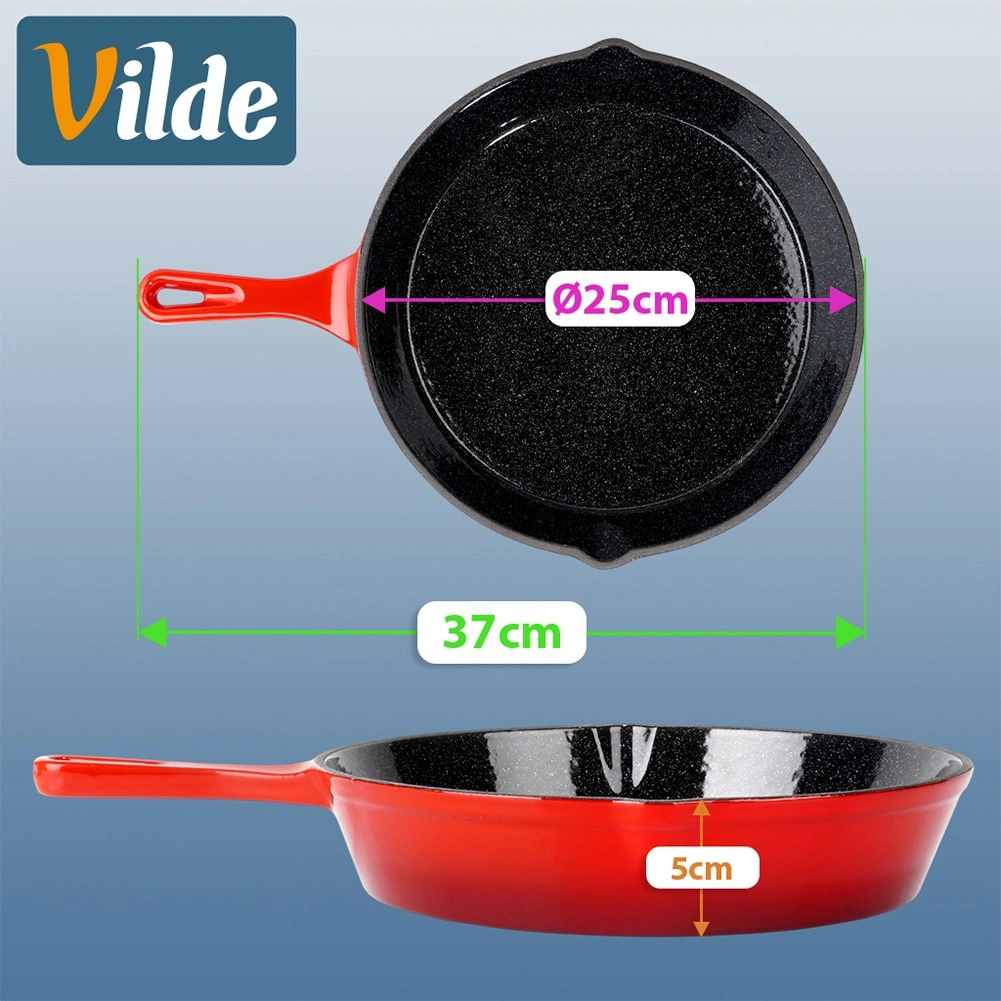 Solidna żeliwna patelnia o średnicy 25 cm z czarną nieprzywierającą, emaliowaną powłoką wewnętrzną i czerwonym wykończeniem zewnętrznym. Zapewnia równomierne rozprowadzanie ciepła, długie utrzymanie temperatury i nadaje się na gaz, kuchenkę elektryczną, ceramiczną oraz indukcję, do piekarnika i na grill. W zestawie silikonowa nakładka na uchwyt dla bezpiecznego przenoszenia oraz dwa dziobki do przelewania dla łatwego serwowania.