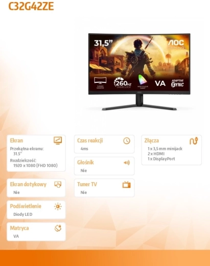 Ciesz się płynną rozgrywką na zakrzywionym monitorze AOC 31,5" z panelem VA, wysoką częstotliwością odświeżania 240 Hz i szybką reakcją. Dzięki zakrzywieniu dla większego zanurzenia, złączom HDMI i DisplayPort oraz nowoczesnemu gamingowemu wzornictwu otrzymujesz świetny stosunek ceny do wydajności.
