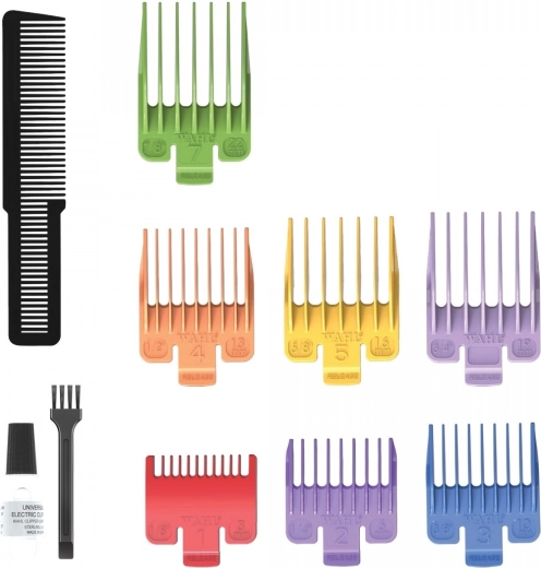 Za precyzyjną długość odpowiada dźwignia regulacji z trzema pozycjami (0,8 mm, 1,5 mm, 1,8 mm) oraz 7 kolorowych nasadek grzebieniowych (3, 6, 10, 13, 16, 19, 22 mm). Dzięki mocnemu, wysokoobrotowemu silnikowi maszynka jest idealna do krótkiej, gładkiej sierści oraz delikatnych poprawek sierści średniej długości.