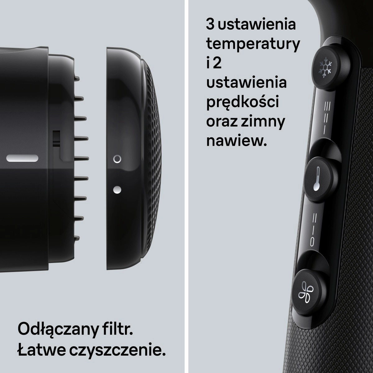 • Wiele poziomów temperatury i prędkości + zimny nawiew do utrwalenia fryzury.