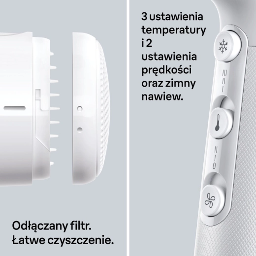 Skorzystaj z kilku poziomów prędkości i temperatury, aby dopasować stylizację do rodzaju włosów, a wykończ zimnym nawiewem dla dodatkowego blasku i dłuższej trwałości fryzury. Wyjmowany filtr ułatwia czyszczenie i wydłuża żywotność urządzenia.