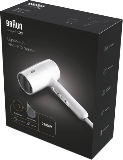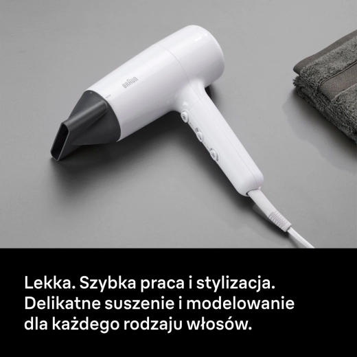 Lekka i wydajna suszarka do włosów z dyfuzorem dla naturalnej objętości i wyraźnie zdefiniowanych fal. Oferuje moc 2100 W, regulowany nadmuch i temperaturę oraz funkcję zimnego powietrza dla długotrwałego utrwalenia fryzury.