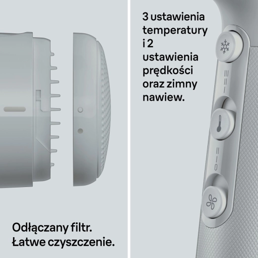 Obsługa jest intuicyjna: kilka poziomów temperatury i prędkości pozwala dopasować suszenie do rodzaju włosów. Funkcja zimnego nawiewu domyka łuski włosa i wydłuża trwałość fryzury. Wyjmowany tylny filtr ułatwia czyszczenie i przedłuża żywotność urządzenia.