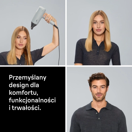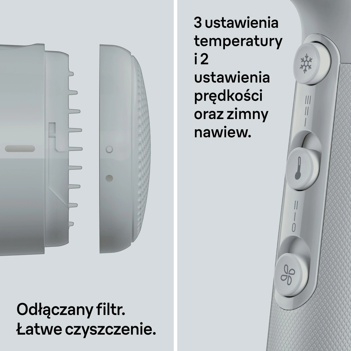 Kompaktowa, ergonomiczna konstrukcja, wiele ustawień temperatury i prędkości oraz przycisk zimnego nawiewu dla idealnego dopasowania suszenia.