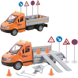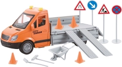 Platforma z odchylanymi rampami umożliwia łatwy załadunek i rozładunek akcesoriów. Dzieci mogą odgrywać autentyczne prace drogowe i działania serwisowe.