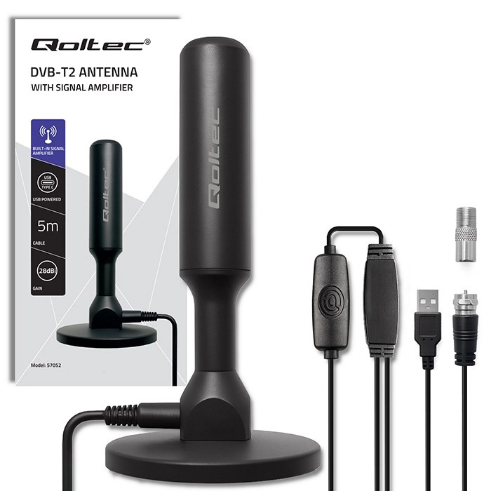 Zasilanie bezpośrednio z telewizora lub dekodera przez USB. Złącze F-Male pasuje do większości tunerów i telewizorów DVB-T/T2.