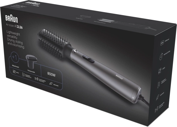 Lekka i wszechstronna suszarko‑lokówka o mocy 800 W do stylizacji i zwiększania objętości. Technologia jonizacji wygładza włosy i redukuje puszenie. Oferuje proste sterowanie suwakiem, 2 wymienne nasadki z zabezpieczającą blokadą, koncentrator do suszenia oraz owalną szczotkę termiczną dla objętości. Łatwą konserwację zapewnia wyjmowany tylny filtr i dołączona szczoteczka czyszcząca.