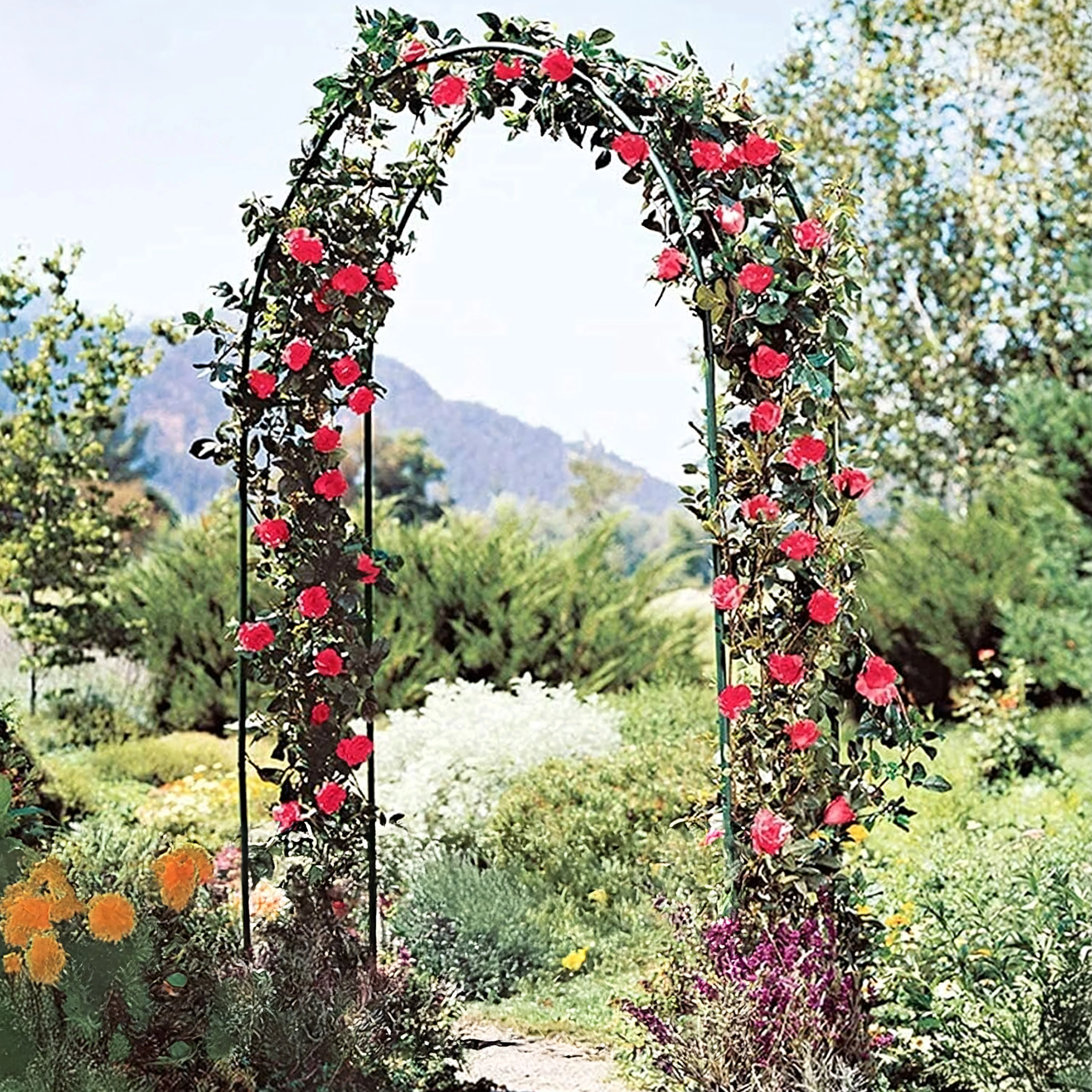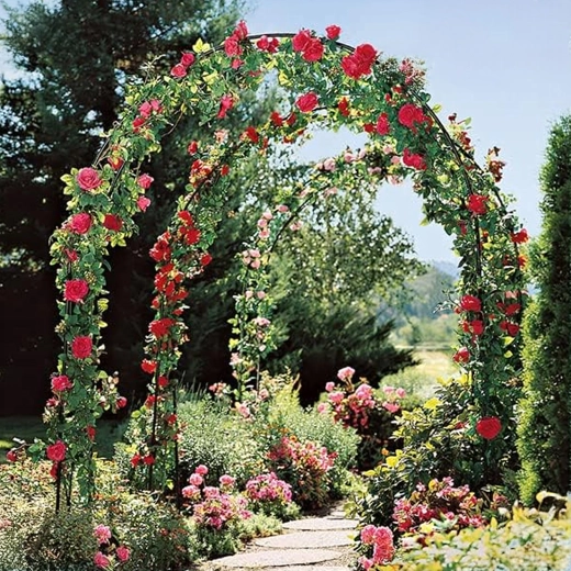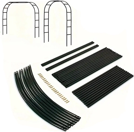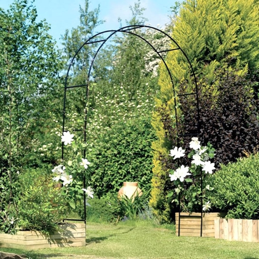 Elegancki ogrodowy łuk z wytrzymałego metalu tworzy efektowne wejście do ogrodu i zapewnia solidne oparcie dla róż, winorośli i powojników. Łatwy montaż z elementów rurowych oraz uniwersalny design do dekoracji, bram ślubnych i roślin pnących.