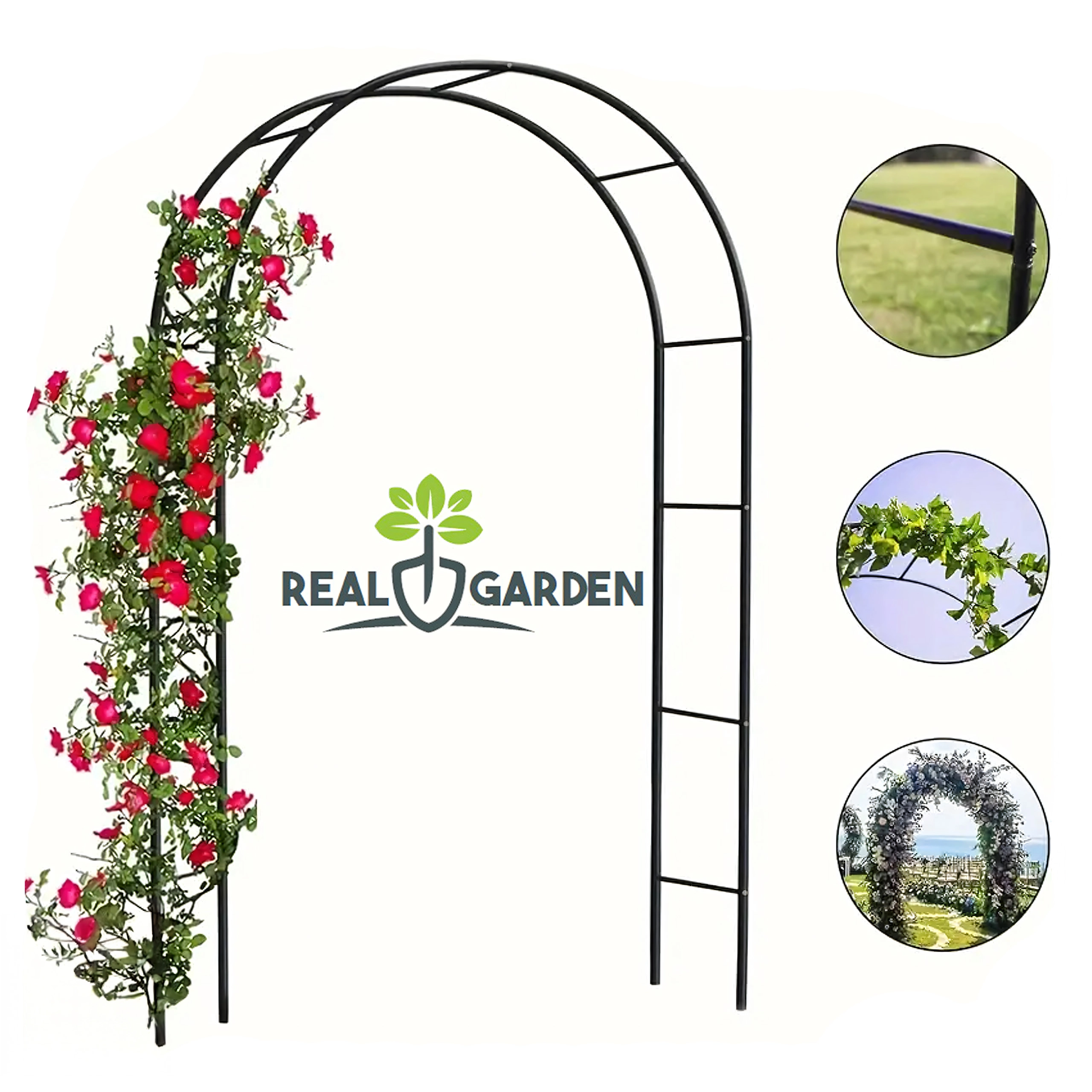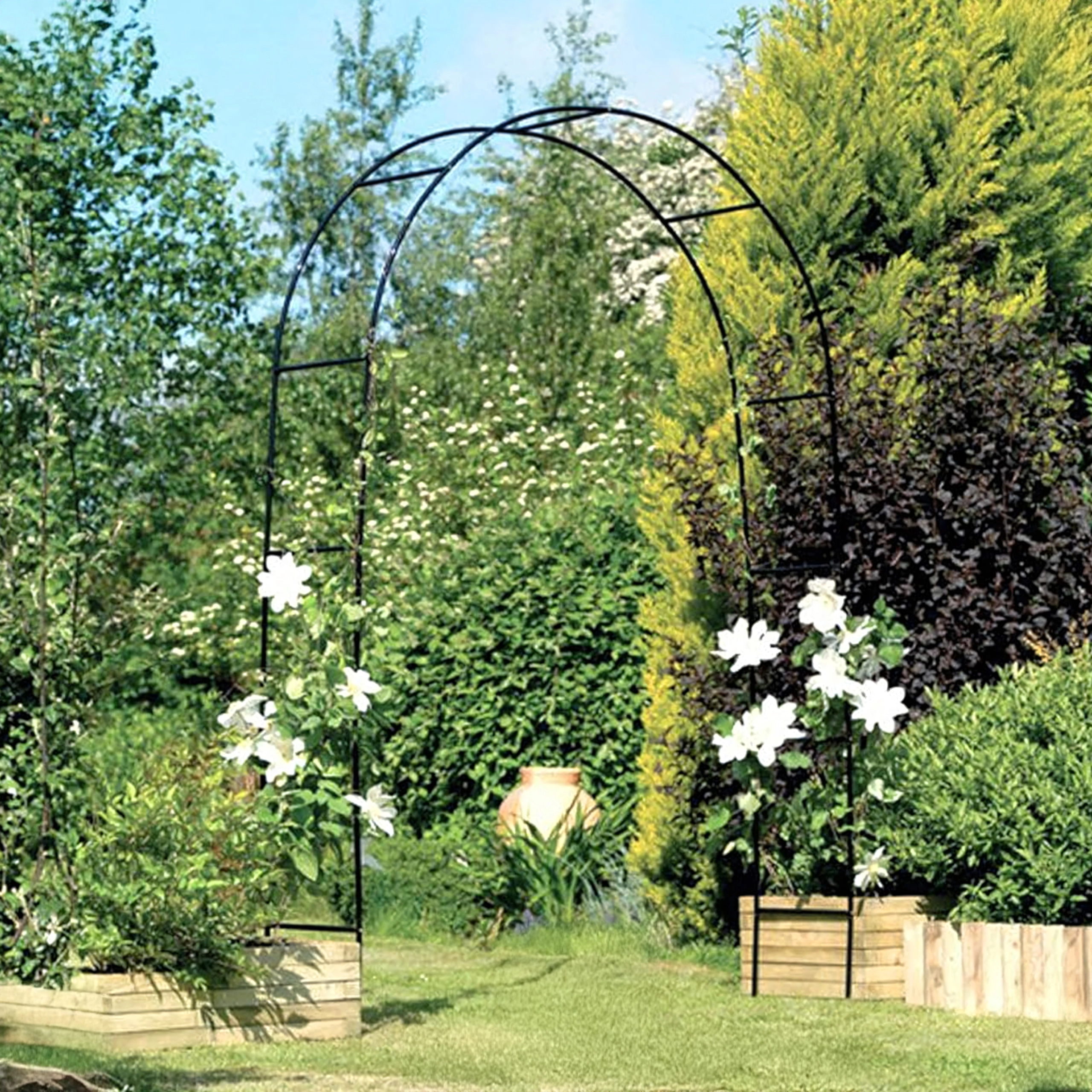 Dzięki modułowemu systemowi rur montaż jest szybki i intuicyjny. Minimalistyczny czarny wygląd pasuje do ogrodów nowoczesnych i klasycznych, na śluby i przyjęcia w plenerze. Wystarczy osadzić nogi w ziemi lub w donicach i pozwolić roślinom piąć się w górę.