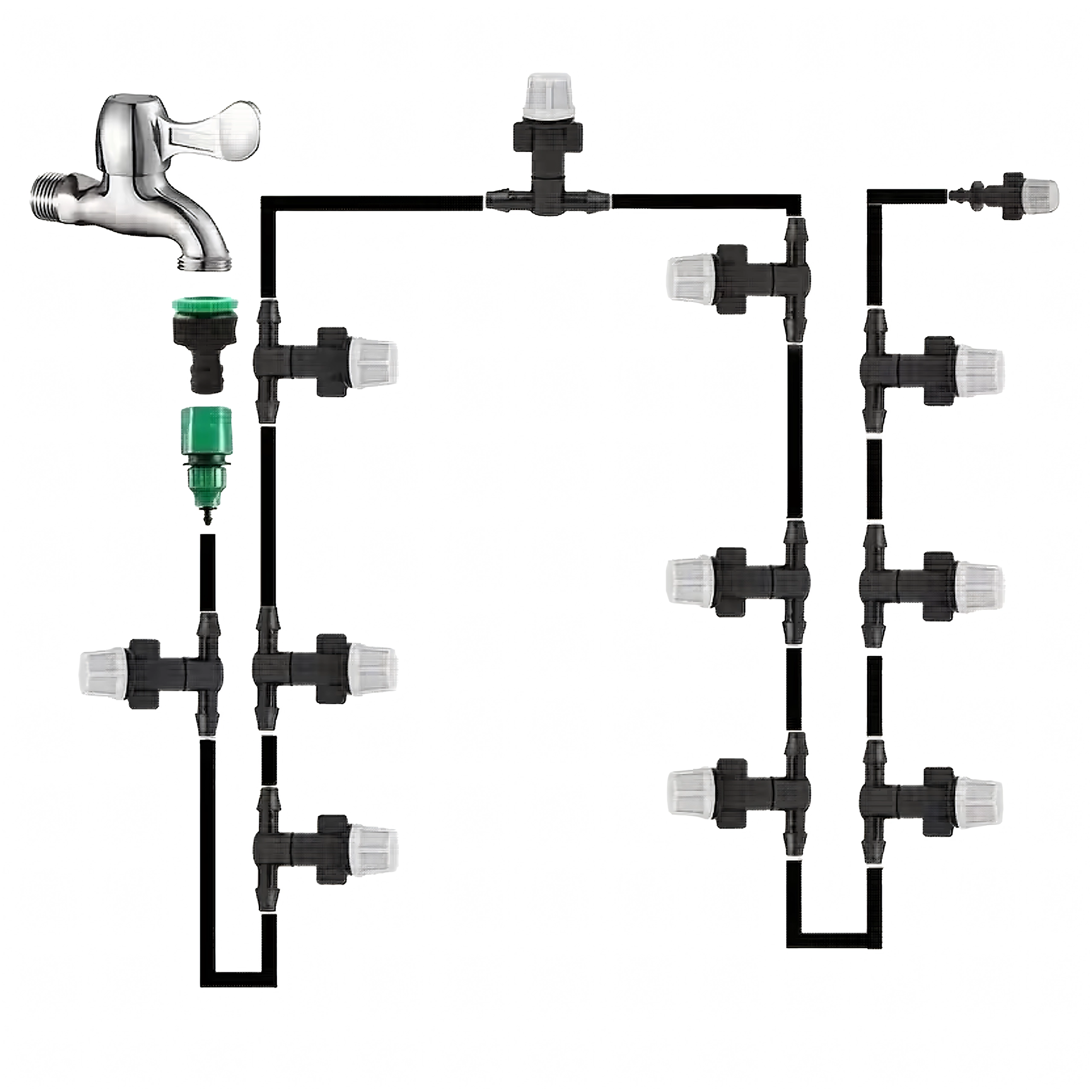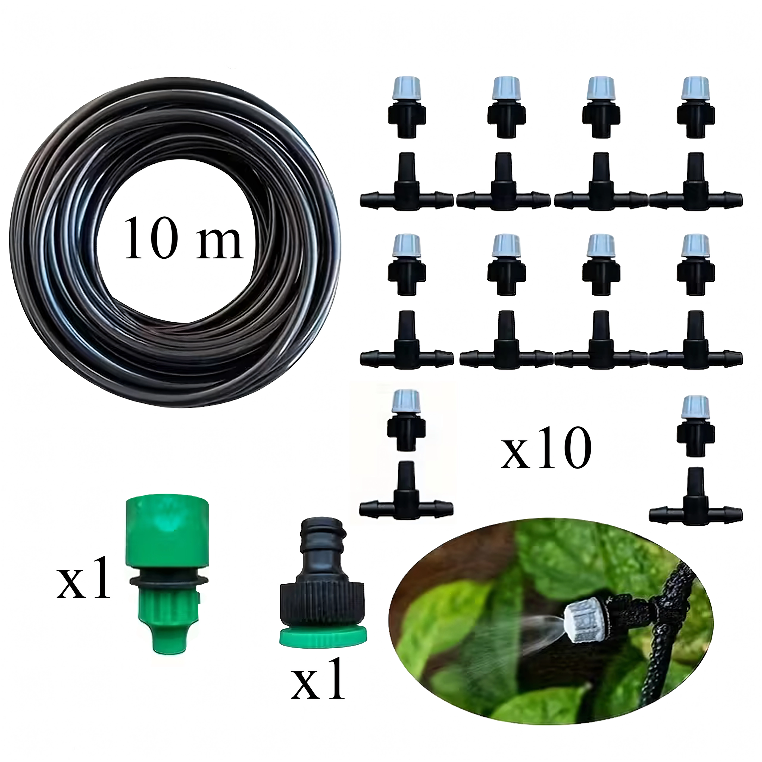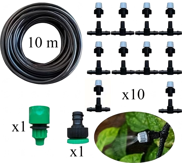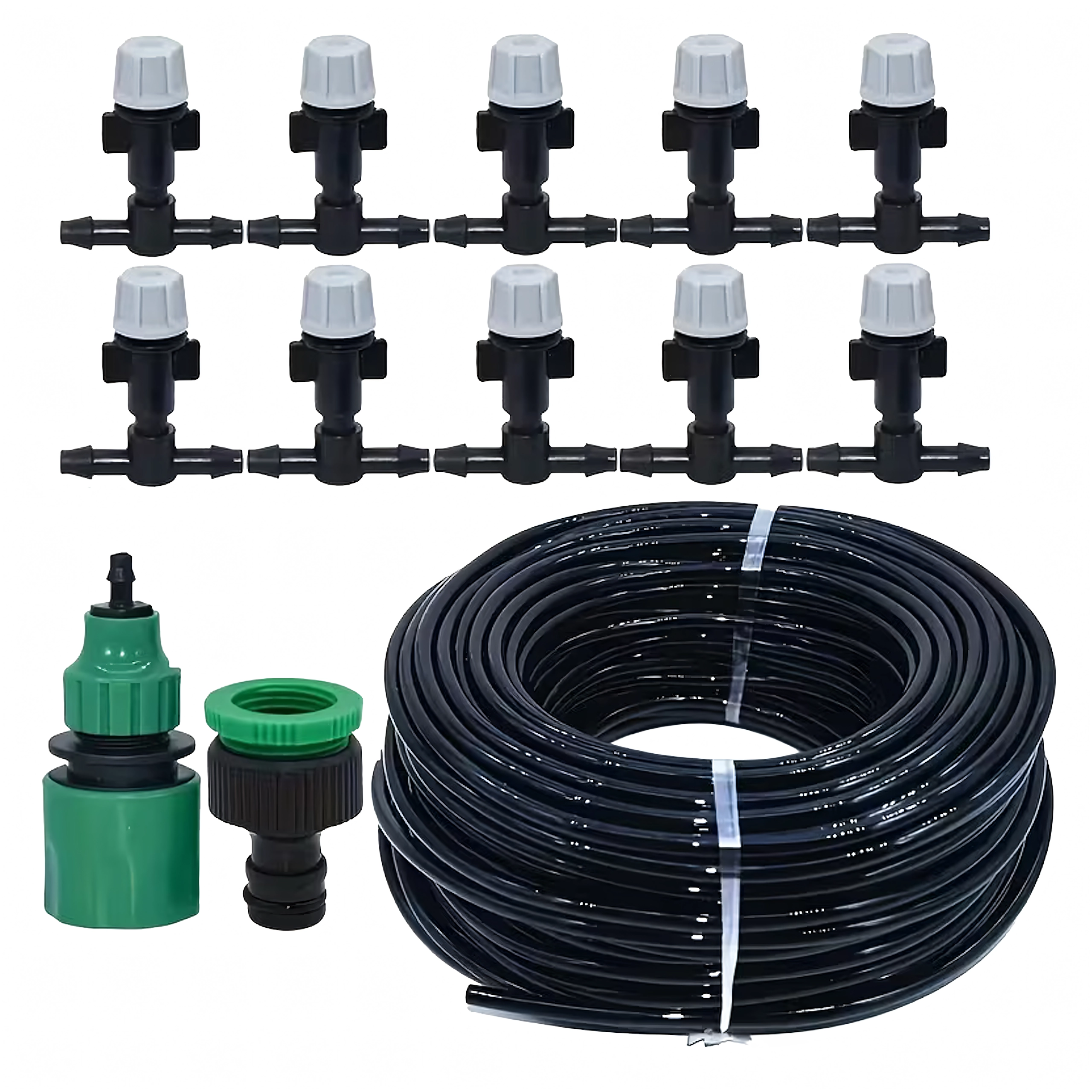 Ten uniwersalny ogrodowy system mgiełkowy zapewnia delikatne i równomierne nawadnianie bezpośrednio do korzeni oraz na liście. Dzięki regulowanym dyszom stworzysz delikatną chłodzącą mgiełkę na tarasach i w szklarniach lub ukierunkowany mikronatrysk dla grządek i skrzynek. System zapewnia stabilny rozdział wody do wielu punktów i łatwo się rozbudowuje za pomocą trójników.