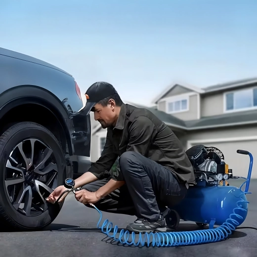 Spust pistoletowy umożliwia intuicyjną regulację przepływu powietrza. Łatwo dopompujesz opony samochodu, motocykla i roweru.