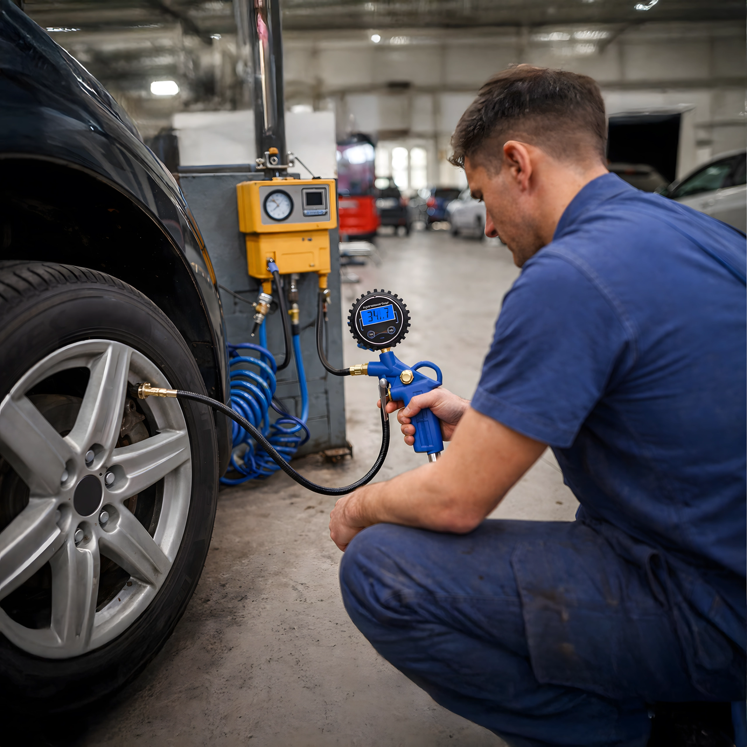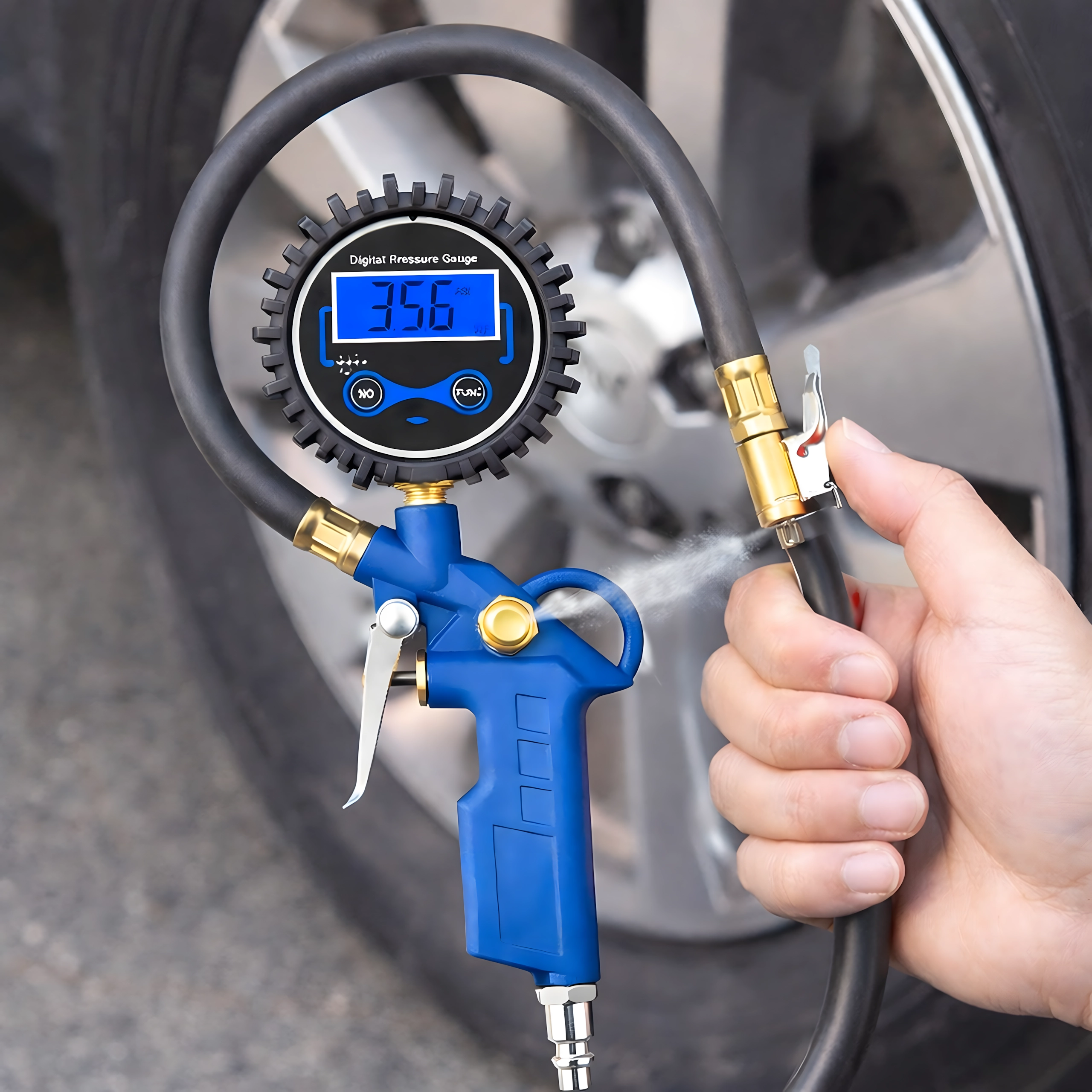 Ta cyfrowa pompkopistolet łączy precyzyjny pomiar i wygodne dopompowywanie w jednym narzędziu. Solidny ergonomiczny uchwyt ze spustem, elastyczny wąż z mosiężną końcówką oraz czytelny podświetlany wyświetlacz gwarantują komfortową pracę i niezawodne rezultaty.