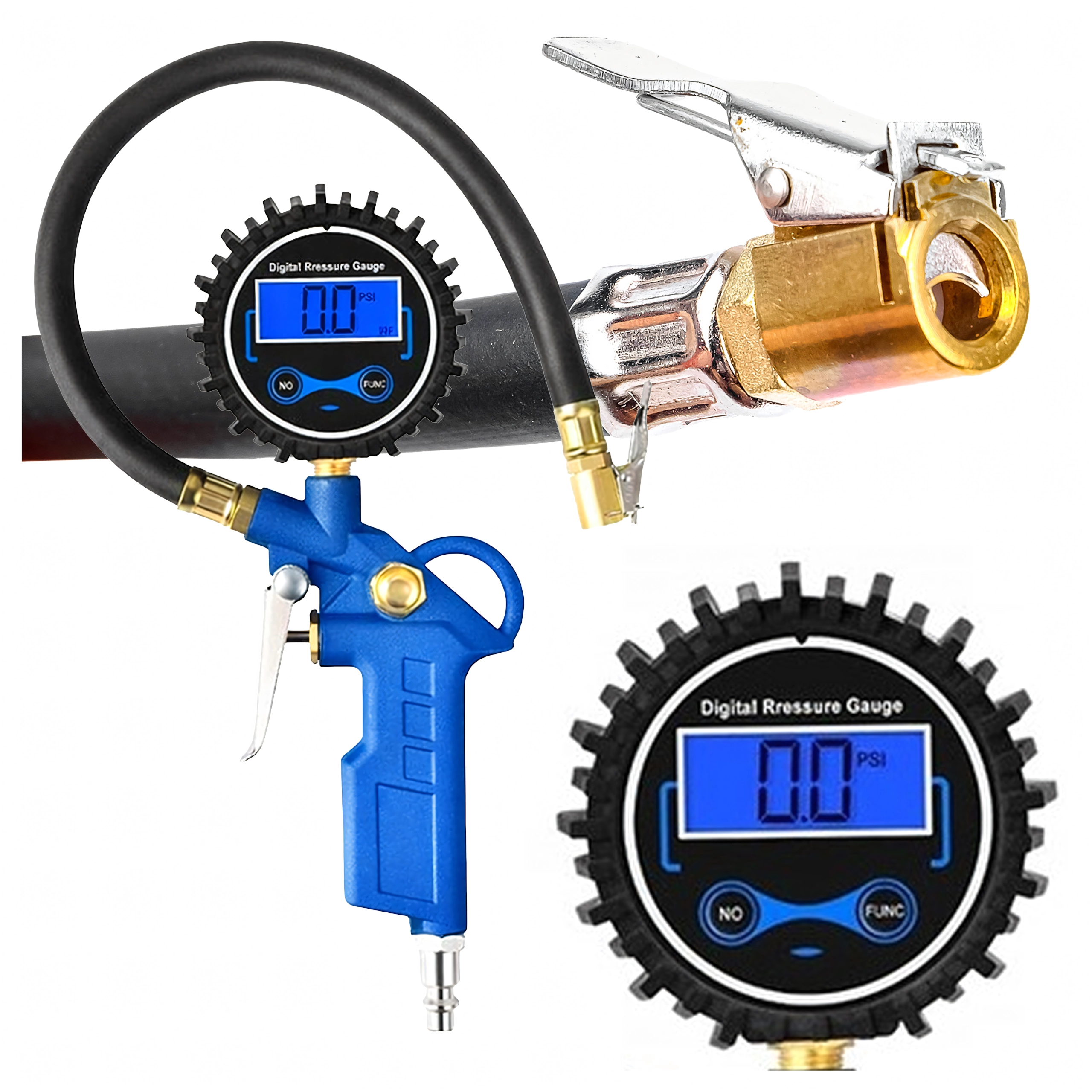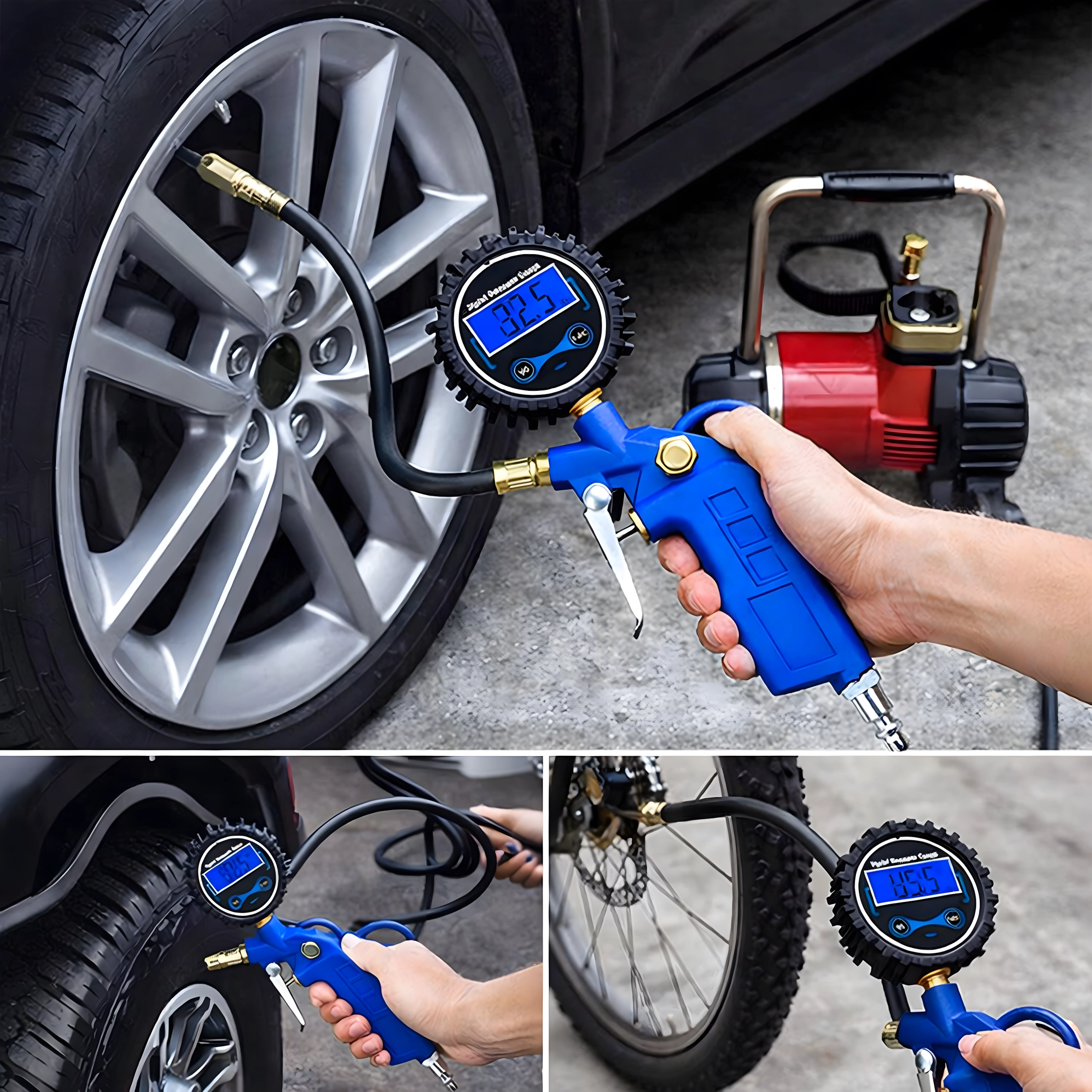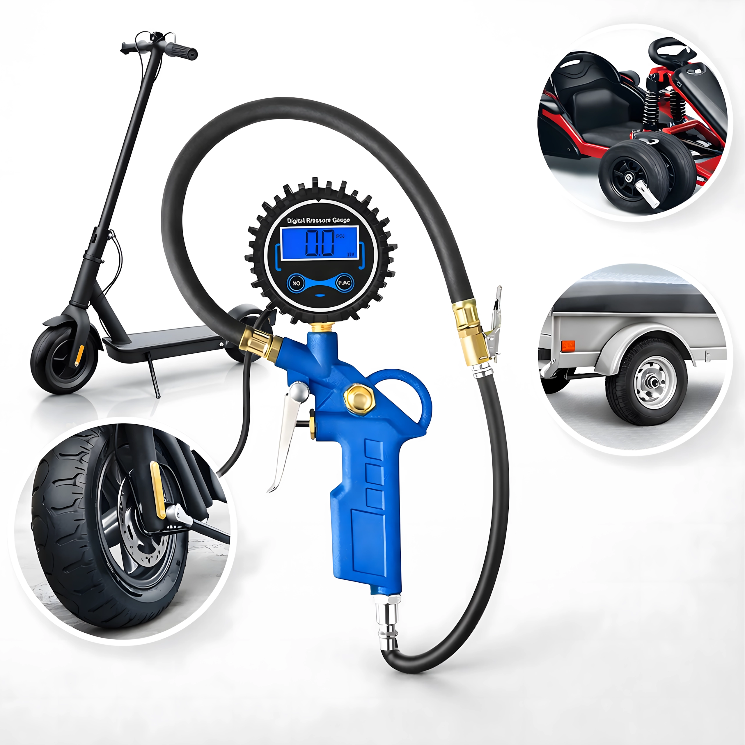 Zintegrowany elektroniczny manometr umożliwia szybkie sprawdzenie ciśnienia i dokładne dopompowanie bez potrzeby dodatkowych narzędzi. Odpowiedni do opon samochodów osobowych, motocykli i rowerów oraz do pracy z warsztatowym kompresorem.