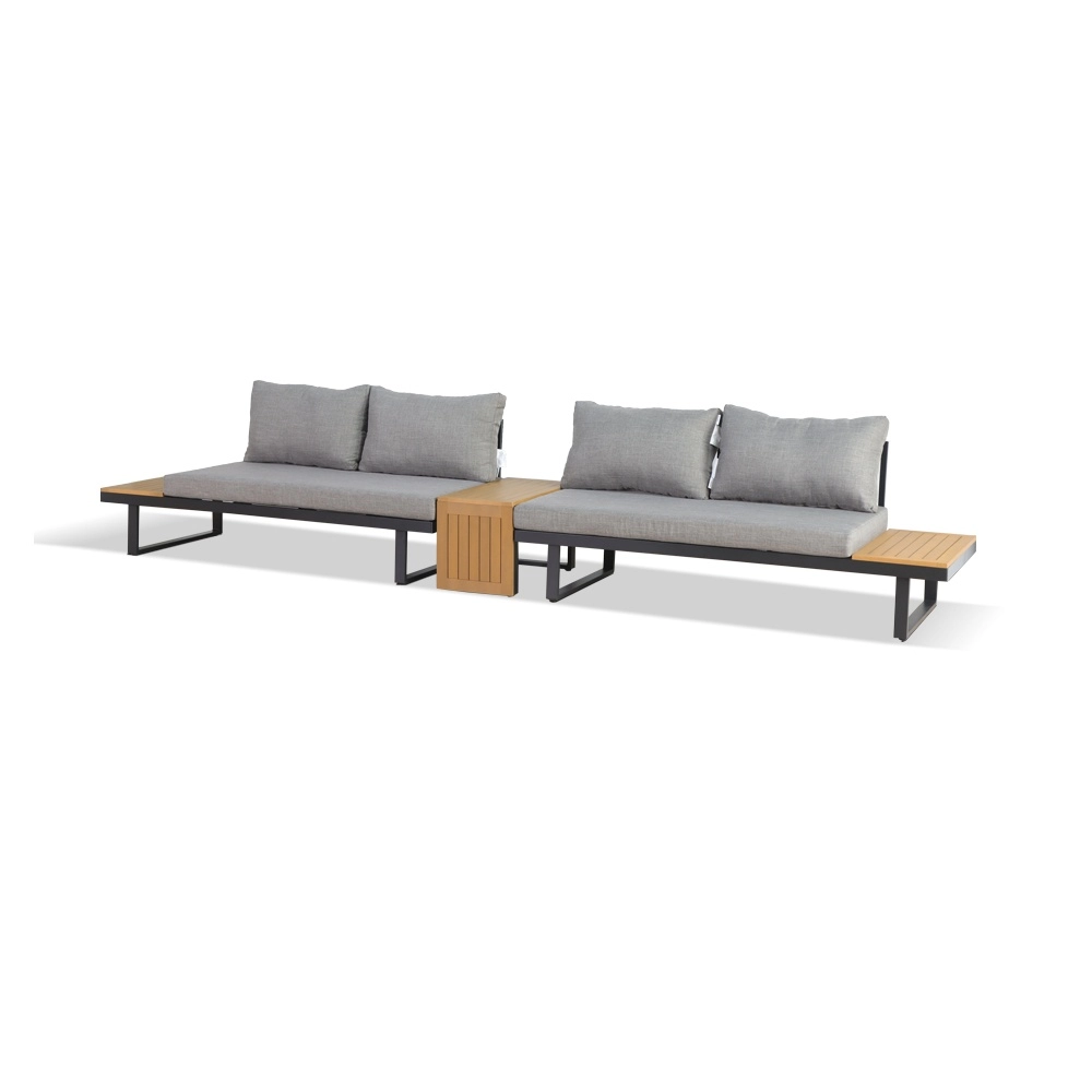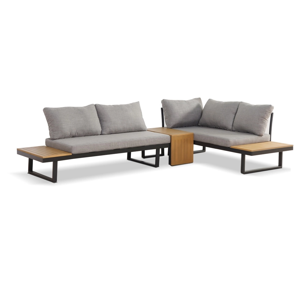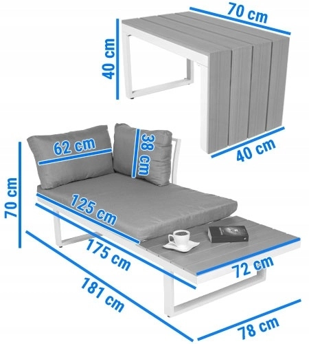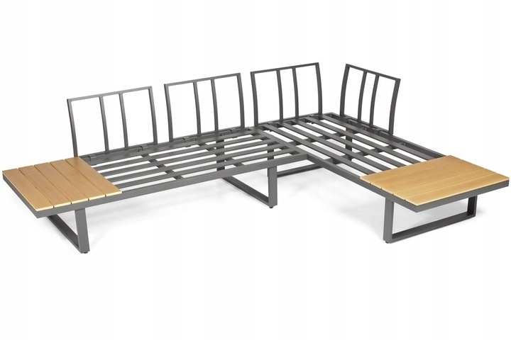 Zintegrowane boczne półki i stolik kawowy z dekorem drewna z polywoodu oferują praktyczne miejsce do odstawiania bez potrzeby impregnacji. Dzięki odporności na korozję, wilgoć i UV zestaw jest świetnym wyborem na taras, do ogrodu, na patio i przy basenie.