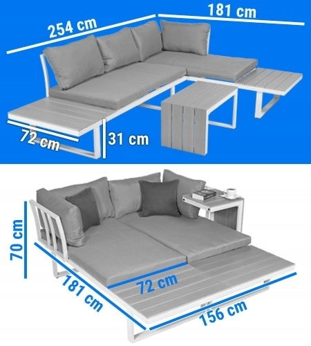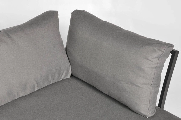 Ten nowoczesny zestaw ogrodowy z lakierowanego aluminium wnosi czysty design i wysoką odporność do każdej strefy zewnętrznej. Modułowa koncepcja umożliwia szybką zmianę układu w zależności od przestrzeni i okazji – od sofy narożnej przez dwie oddzielne sofy aż po wygodne łóżko. Grube szare poduszki z zdejmowanymi poszewkami na zamek gwarantują komfort podczas codziennego relaksu.