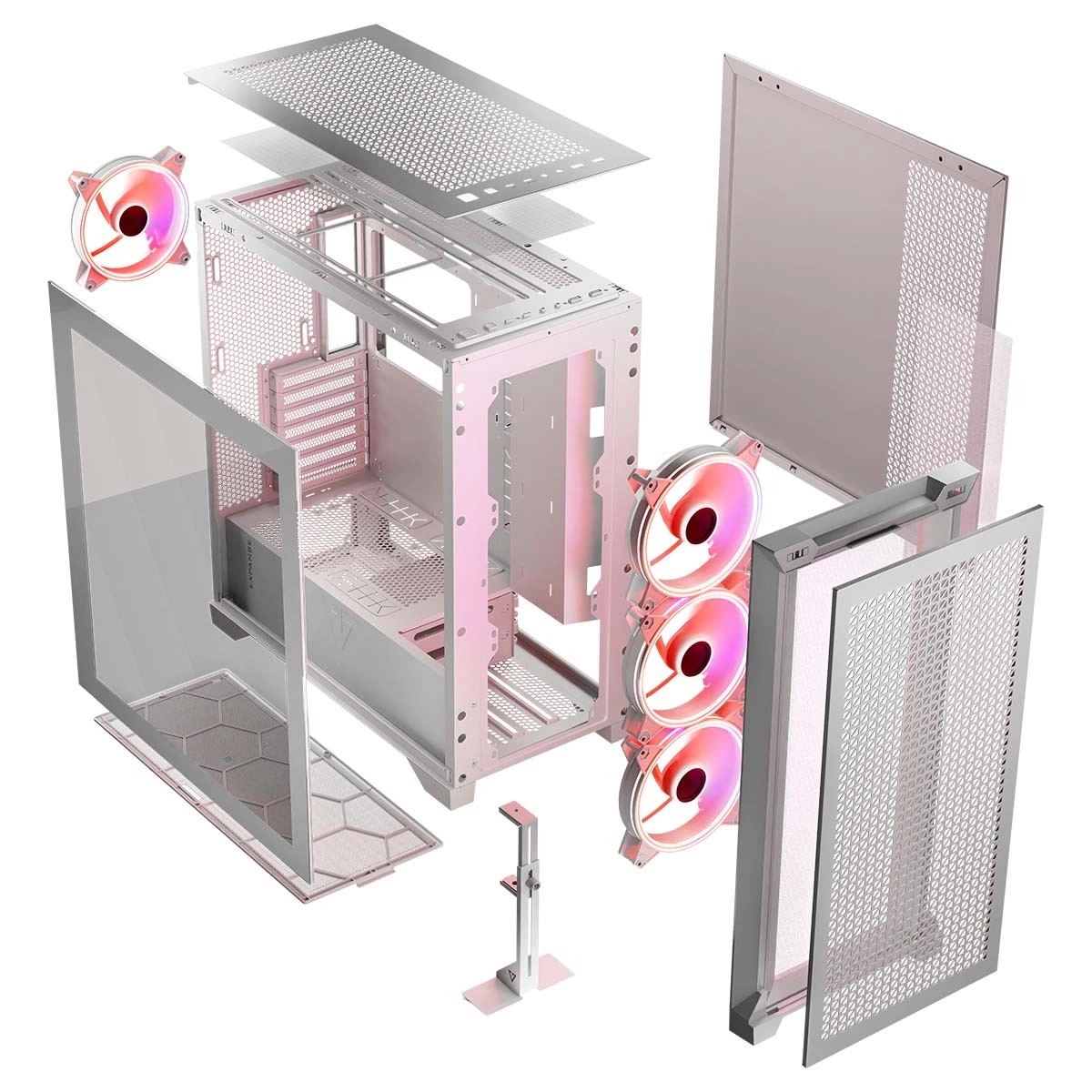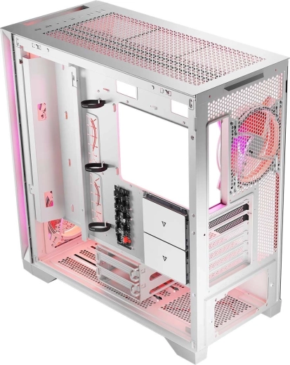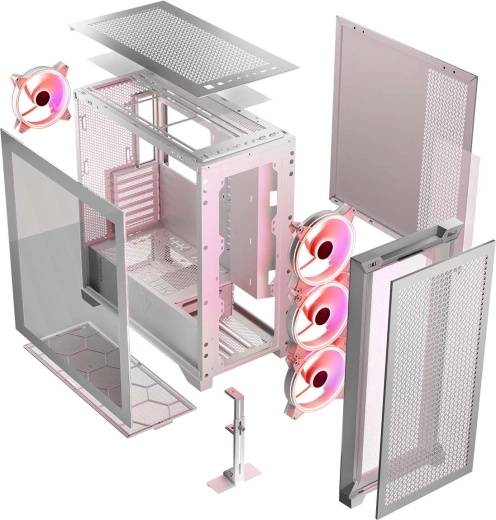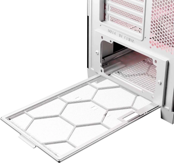 Nie brakuje śrubowanych zaślepek PCI/PCIe ani możliwości pionowego montażu GPU dzięki wyjmowanej ramie. Zyskujesz przewiewną, praktyczną i modularną obudowę do budowy wydajnego komputera gamingowego z doskonałym chłodzeniem i uporządkowanym okablowaniem.