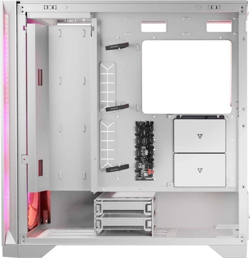 Obudowa obsługuje chłodnice wodne do 360 mm z przodu, na górze i na ramie przy płycie głównej (do grubości 52 mm) oraz 120/140 mm z tyłu. Beznarzędziowe panele na zatrzaski przyspieszają serwis i modernizację, zintegrowany kontroler ARGB/wentylatorów obsługuje do 9 wentylatorów, a górny panel I/O oferuje 2× USB 3.0, USB‑C, audio i sterowanie wentylatorami. Dla danych przygotowano 2× 2,5" uchwyty przy płycie głównej oraz 2× 3,5" w tunelu zasilacza.