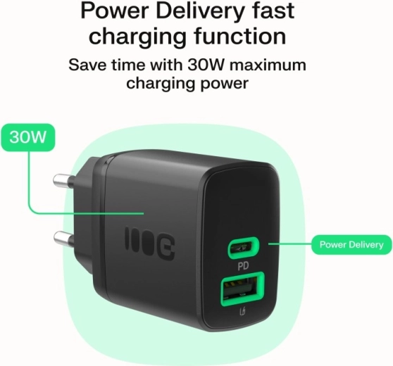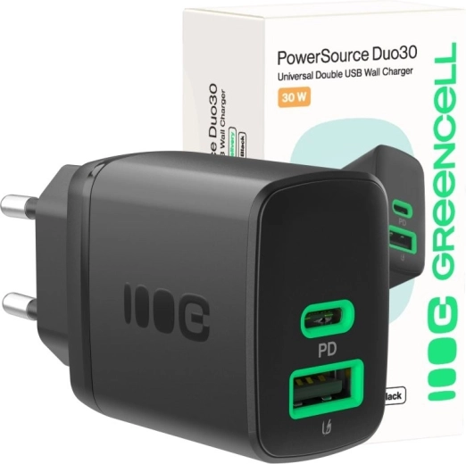 Zapomnij o długim oczekiwaniu. Dzięki technologii Power Delivery (PD) 30 W naładujesz kompatybilny smartfon do 80% w około 40 minut. Dwa porty – uniwersalne USB‑C oraz tradycyjne USB‑A – zapewniają szeroką kompatybilność, od nowoczesnych telefonów po słuchawki i aparaty.