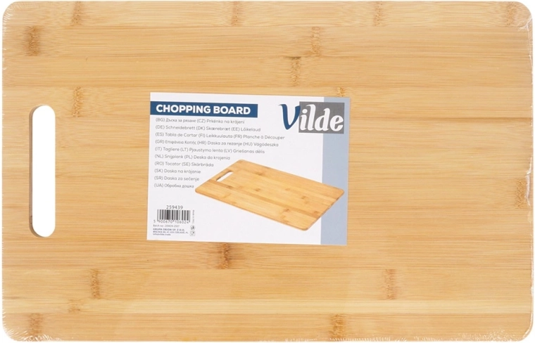 Bambusowa deska w kształcie prostokąta to niezawodny pomocnik w każdej kuchni. Naturalny materiał jest wytrzymały, lekki i delikatny dla noży, dzięki czemu przedłuża ich ostrość. Dzięki zintegrowanemu otworowi/uchwytowi deskę łatwo przenosić i zawieszać.