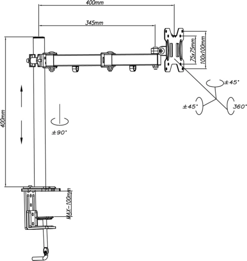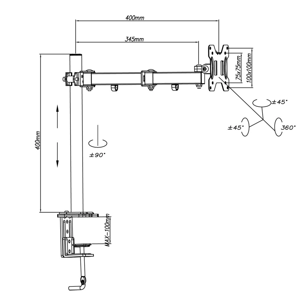 Uchwyt obsługuje pochylenie w zakresie -45° do +45° oraz obrót -90° do +90°, więc łatwo dopasujesz ekran do aktualnego zadania. Zintegrowane ukrywanie okablowania utrzymuje miejsce pracy w czystości i porządku.