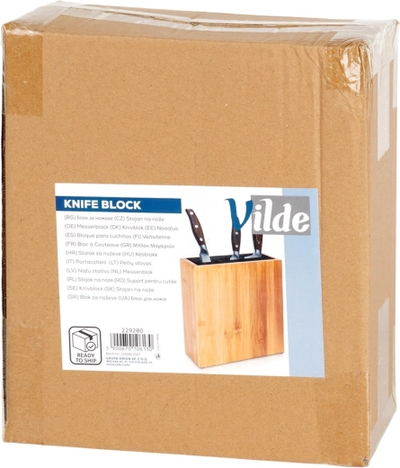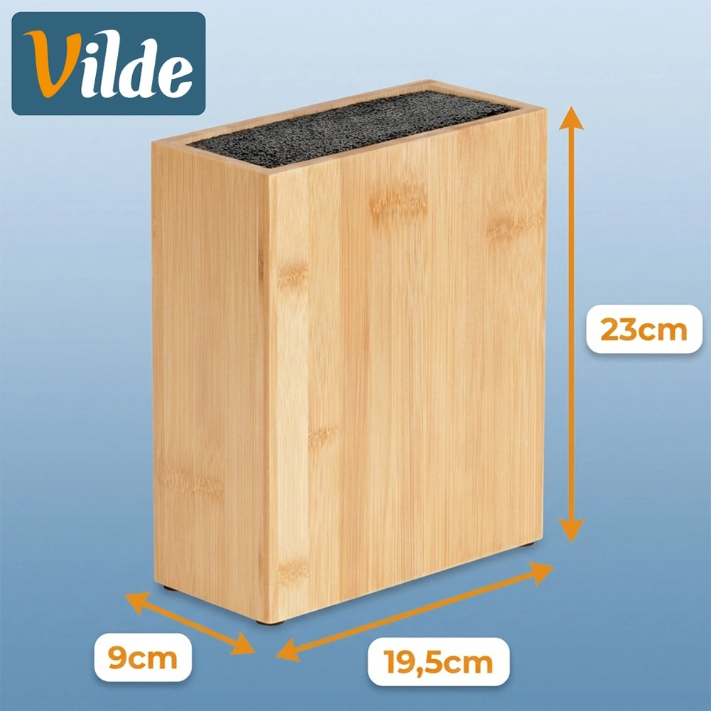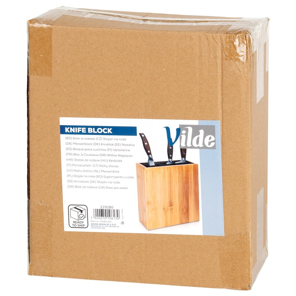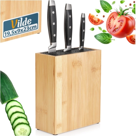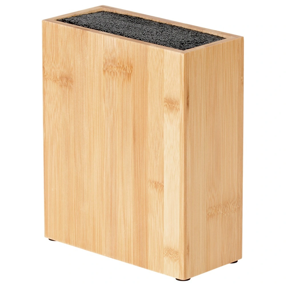 Uniwersalny bambusowy blok na noże o wymiarach 19,5 × 9 × 23 cm do bezpiecznego i przejrzystego przechowywania noży kuchennych i narzędzi. Dzięki wyjmowanej plastikowej wkładce z włókien pomieści noże o różnych rozmiarach i kształtach bez uszkadzania ostrzy. Wytrzymały bambus doda kuchni naturalnej elegancji, a antypoślizgowe filcowe podkładki zapewnią stabilność na blacie roboczym.