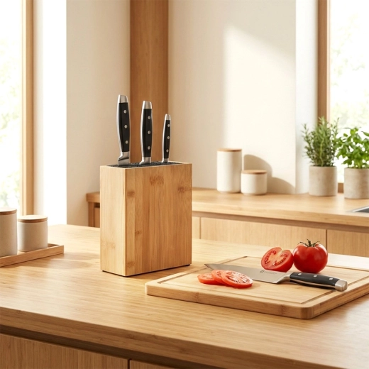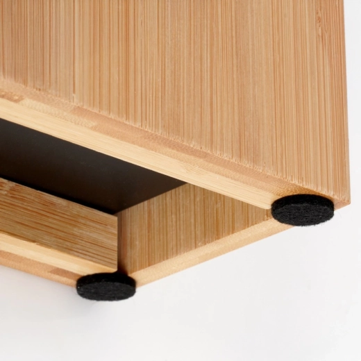Naturalny bambus z gładkim wykończeniem pięknie dopełni kuchnię, a dzięki możliwości użycia filcowych podkładek blok stoi stabilnie na miejscu.