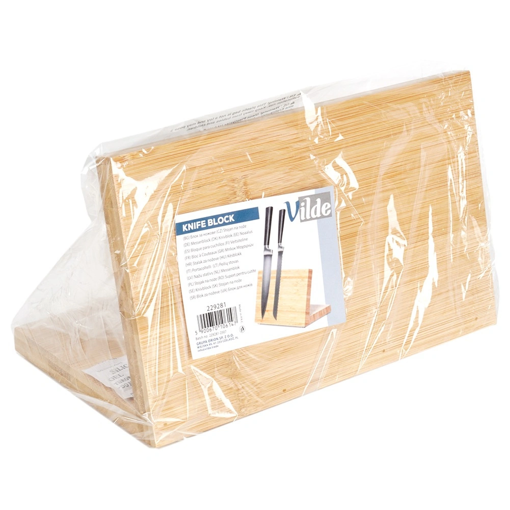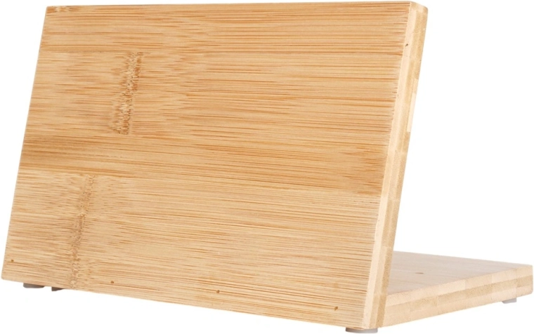 Stojak umożliwia przechowywanie noży o różnych kształtach, nożyczek oraz innych metalowych akcesoriów. Stabilna podstawa z czterema nóżkami zapewnia pewność użytkowania i chroni blat. Naturalny bambus jest trwały, łatwy w utrzymaniu i działa jako dekoracyjny element na kuchennym blacie.