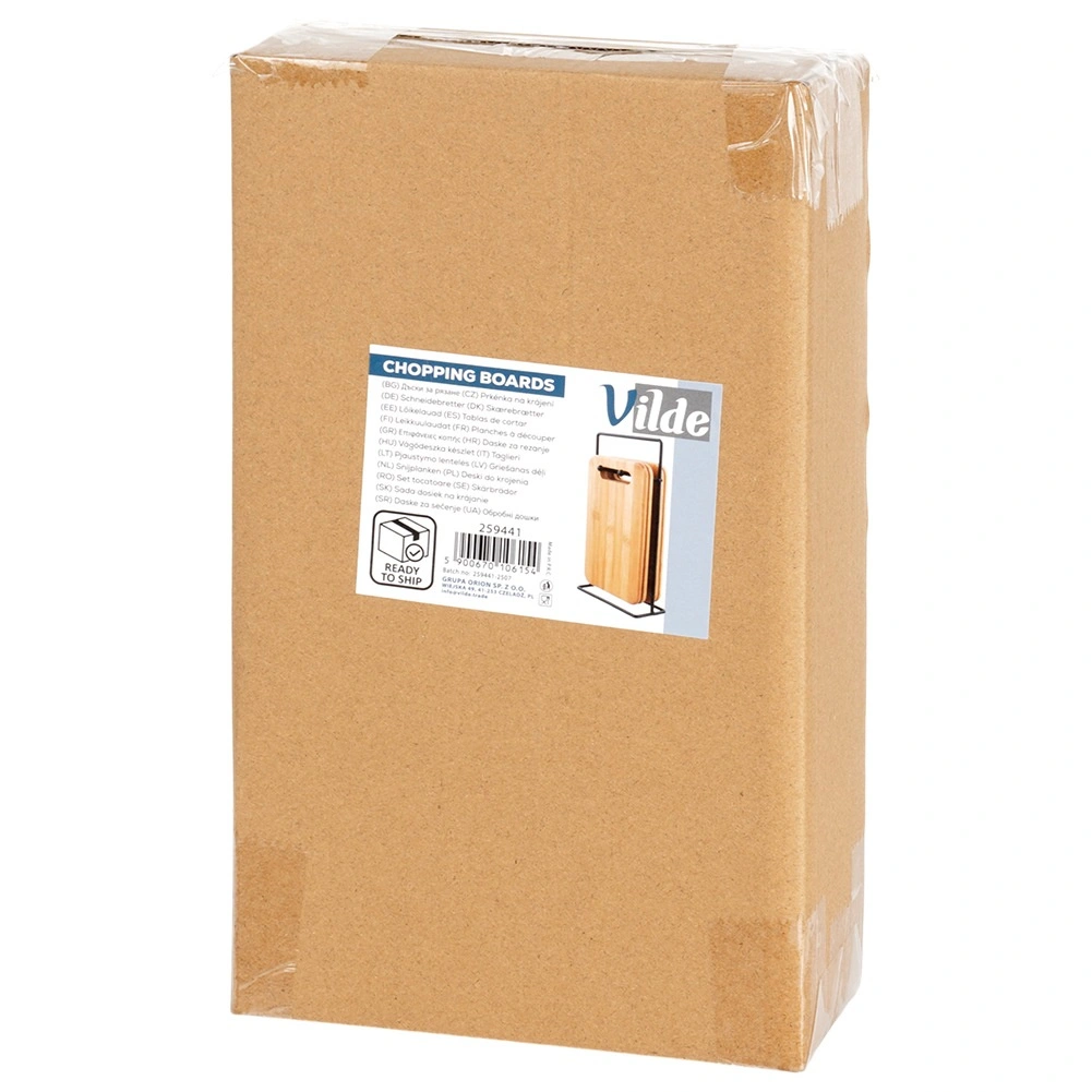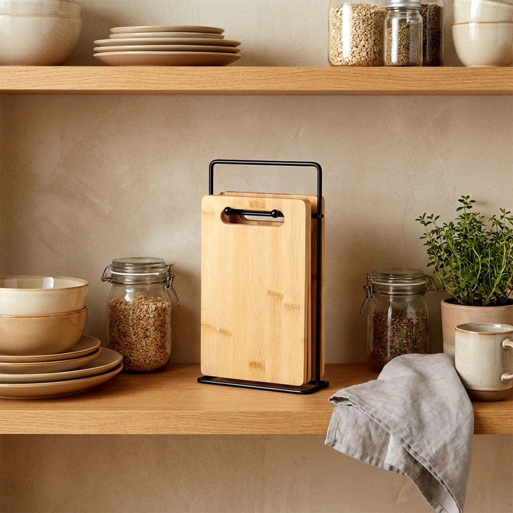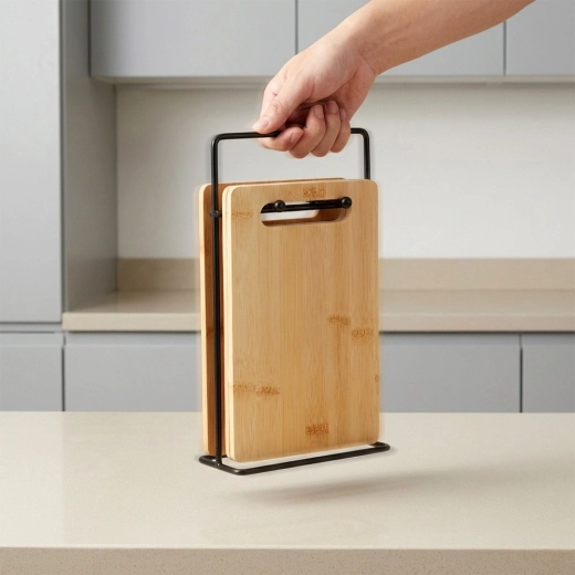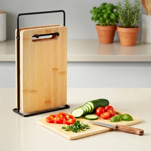 Zestaw bambusowych desek idealnie sprawdzi się do codziennego krojenia warzyw, owoców, pieczywa i mięsa. Dzięki kompaktowym wymiarom nie zajmuje niepotrzebnie miejsca na blacie, a stojak sprawia, że deski są zawsze pod ręką i higienicznie wentylowane. Ponadczasowy, naturalny wygląd pasuje do każdej kuchni.
