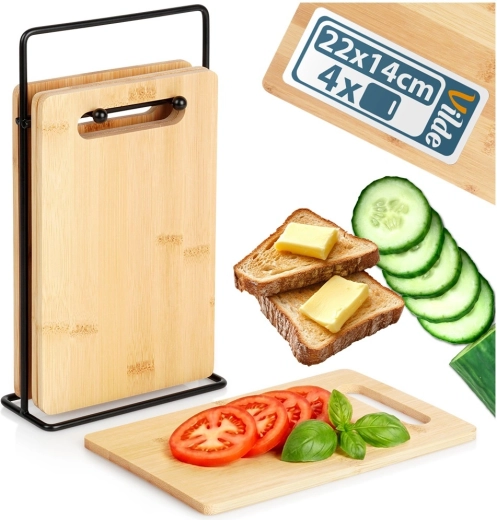 Deski 22 × 14 × 0,7 cm dobrze leżą w dłoni i są idealne do warzyw, owoców, pieczywa oraz mniejszych porcji mięsa. Stojak utrzymuje wszystko w jednym miejscu.