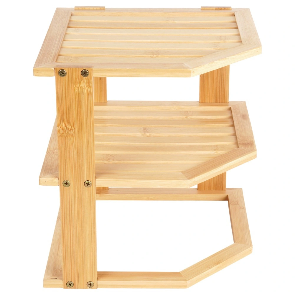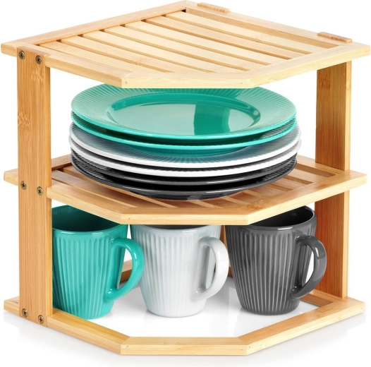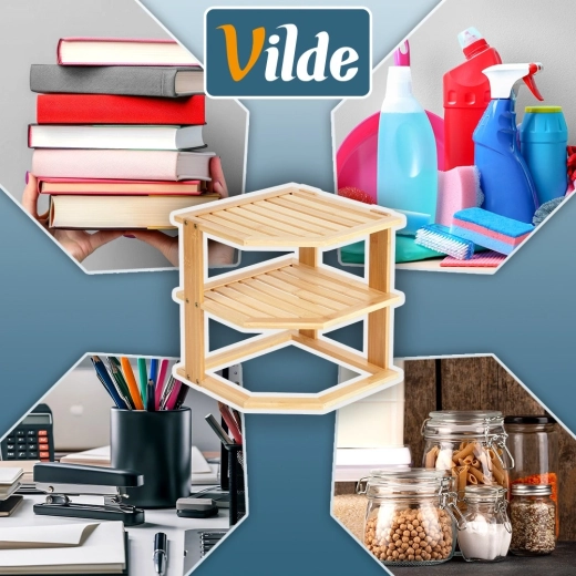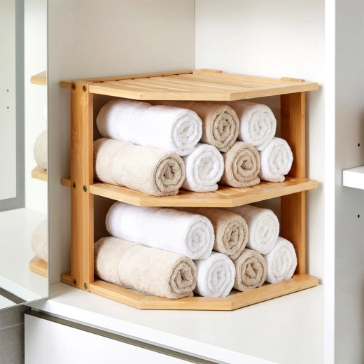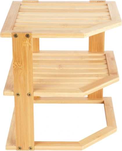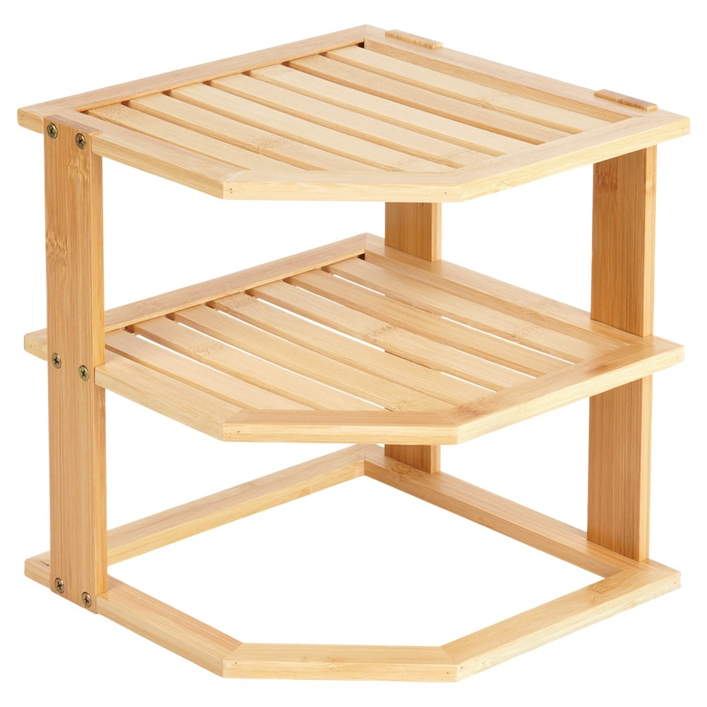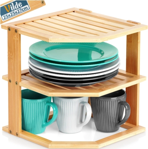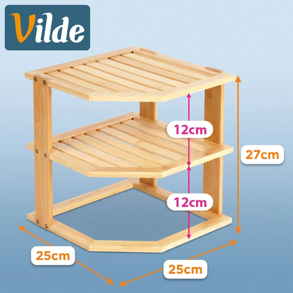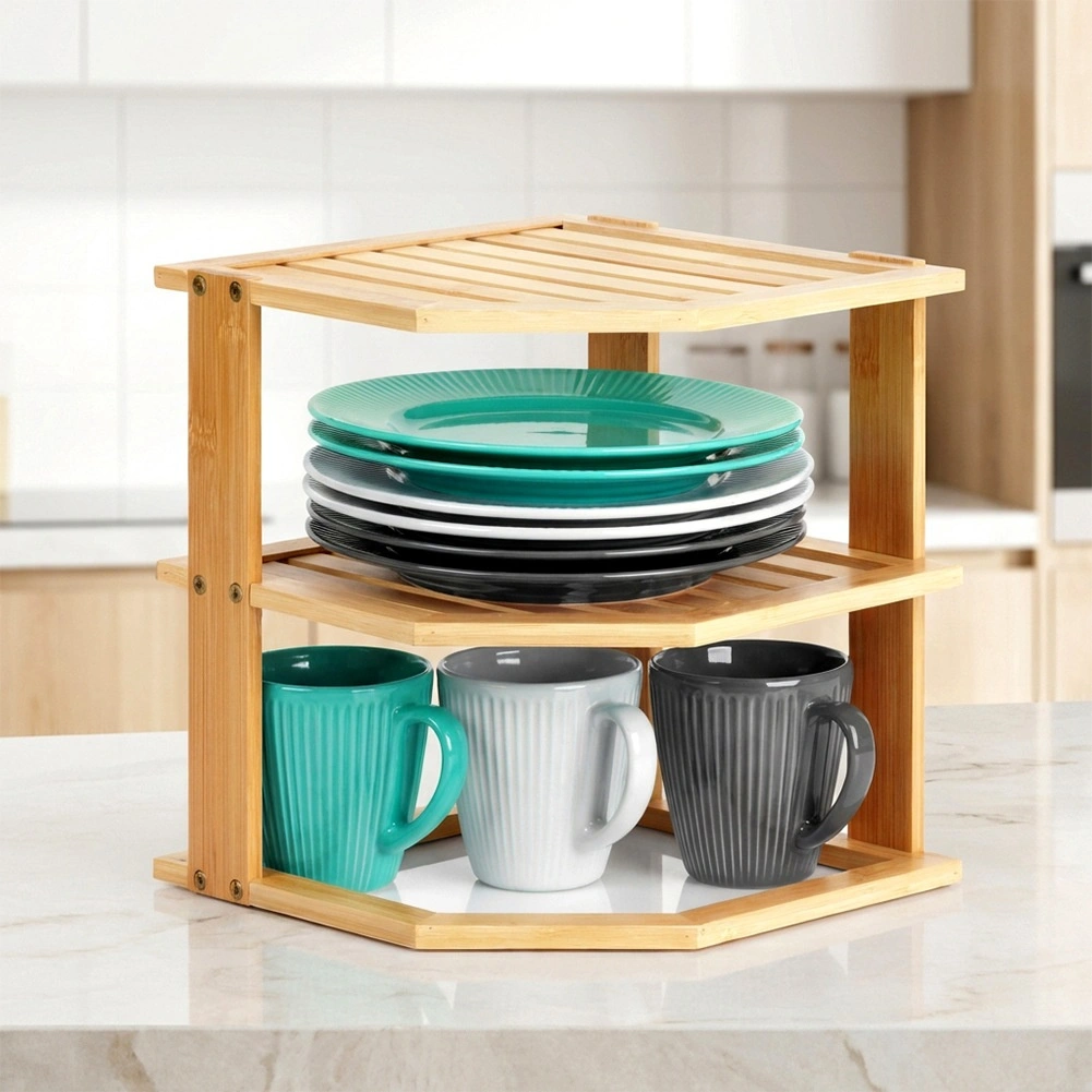Praktyczna narożna półka z drewna bambusowego pomaga sprytnie wykorzystać róg na blacie kuchennym lub w szafce. Oferuje więcej przestrzeni do przechowywania dzięki wielopoziomowej konstrukcji, jest stabilna, odporna na wilgoć i łatwa w utrzymaniu. Idealna na przyprawy, słoiki, kubki czy kosmetyki w kuchni, spiżarni i łazience.