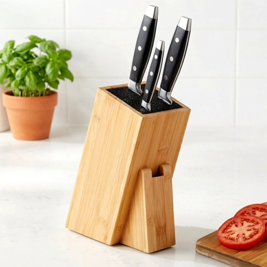 Pochylona górna część ułatwia wkładanie i wyjmowanie noży nawet podczas codziennego gotowania. Stabilna podstawa utrzymuje blok pewnie na miejscu.