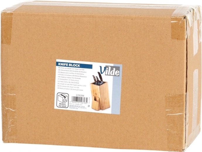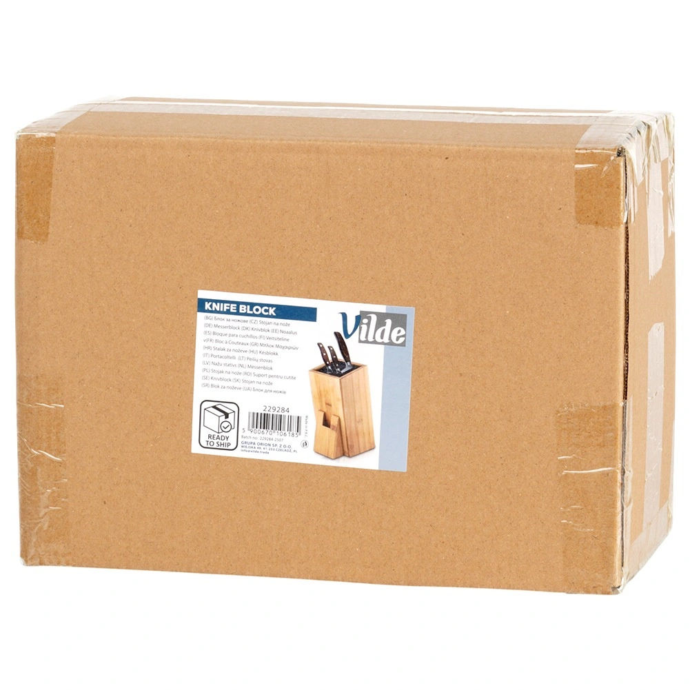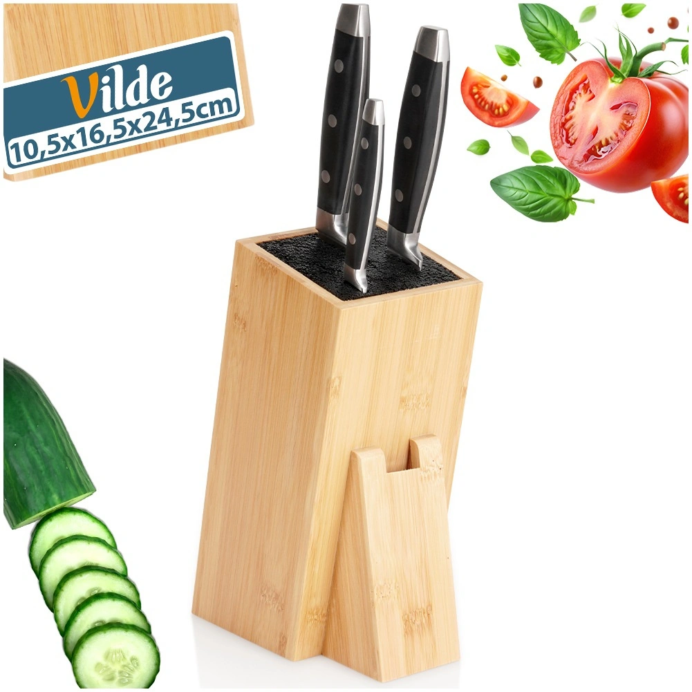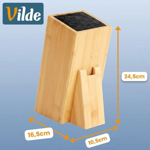 Dzięki kompaktowym wymiarom 10,5 × 16,5 × 24,5 cm blok łatwo mieści się na blacie i utrzymuje narzędzia zawsze pod ręką. Bambus to trwały, higieniczny i zrównoważony materiał, więc stojak jest nie tylko praktyczny, ale i przyjazny dla środowiska. W zestawie znajdują się filcowe podkładki dla delikatnego i stabilnego ustawienia na blacie roboczym.