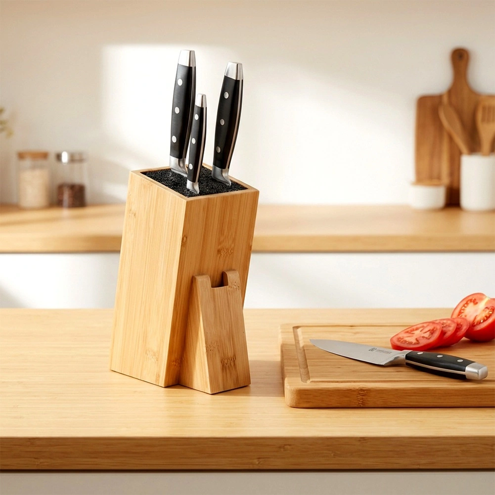 Korpus bloku wykonano z wysokiej jakości drewna bambusowego – trwałego, higienicznego i zrównoważonego materiału o eleganckim, naturalnym wyglądzie.