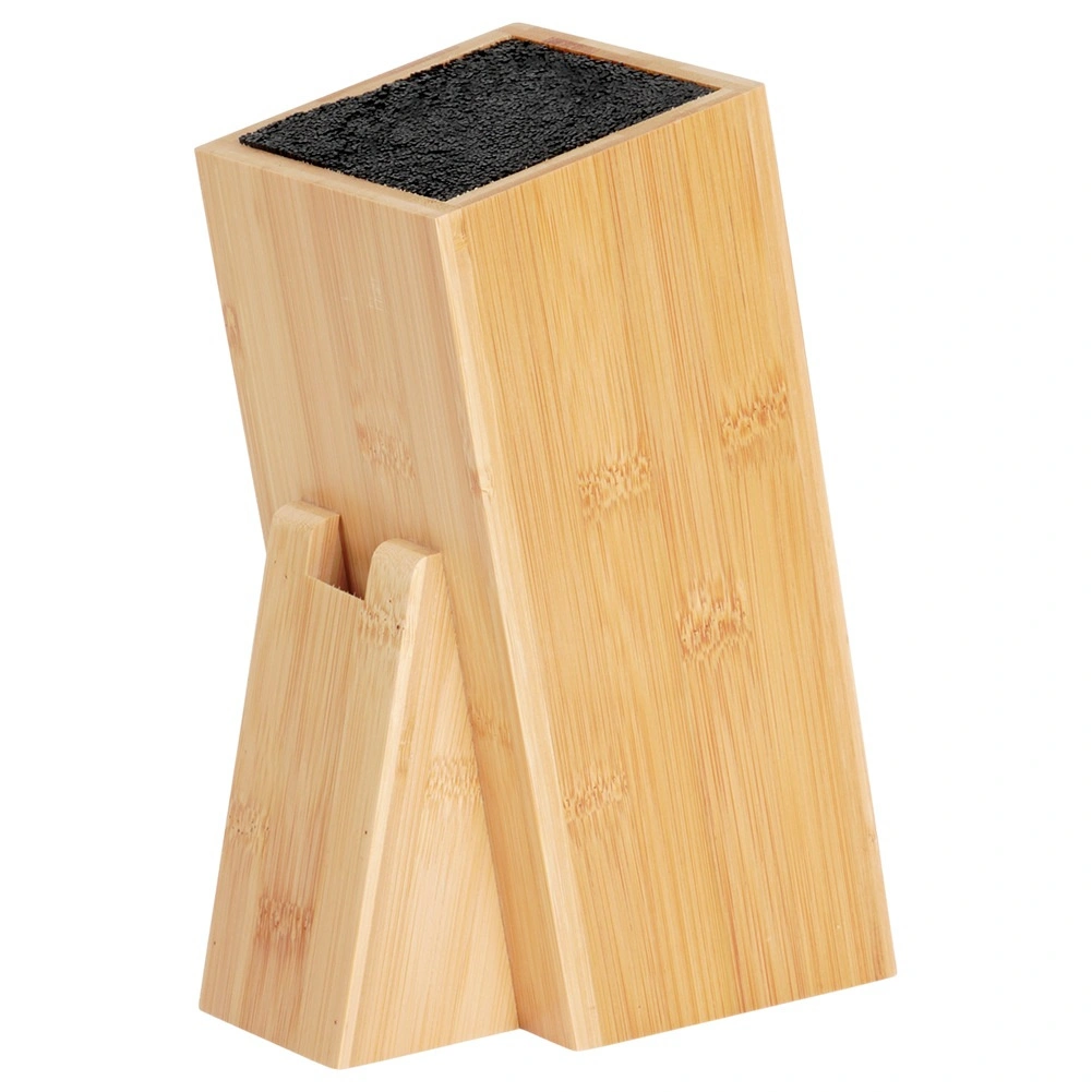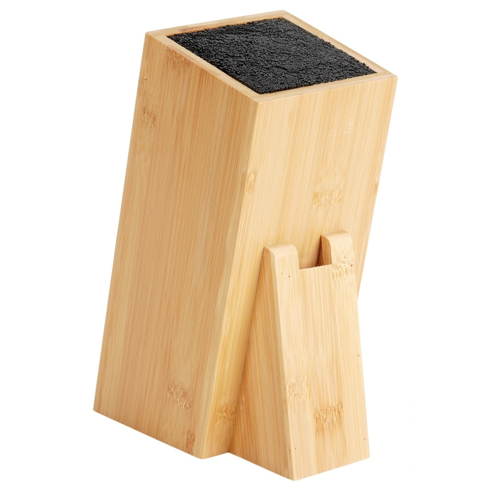 Uniwersalny stojak na noże i przybory kuchenne z wysokiej jakości drewna bambusowego łączy naturalny wygląd, stabilność i praktyczne rozwiązanie przestrzeni do przechowywania. Gęste wyjmowane włókna wewnątrz bloku dopasowują się do każdego ostrza, trzymają je pewnie na miejscu i jednocześnie chronią krawędź przed tępieniem. Skośna konstrukcja zapewnia wygodne wkładanie i wyciąganie noży.