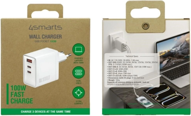 Maksymalna moc 100 W wspiera ładowanie laptopów i ultrabooków, natomiast dwa porty USB‑C z Power Delivery oraz jeden USB‑A z Quick Charge zapewniają szybkie i bezpieczne doładowanie smartfonów, tabletów, słuchawek czy konsol do gier. Inteligentny podział mocy automatycznie dopasowuje prąd do każdego podłączonego urządzenia dla maksymalnej efektywności i ochrony.