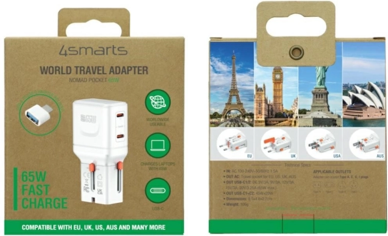 Ta podróżna ładowarka 4smarts World Travel Adapter Nomad Pocket wykorzystuje nowoczesną technologię GaN, która zapewnia wyższą wydajność, mniejsze nagrzewanie i bardziej kompaktowe wymiary przy mocy do 65 W. Bez trudu szybko doładujesz smartfony, tablety oraz wybrane laptopy przez USB Power Delivery.