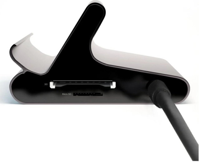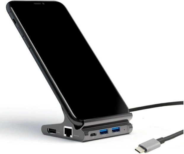 Masywna aluminiowa konstrukcja służy jako regulowany stojak do tabletu lub telefonu. Elementy antypoślizgowe i stabilna podstawa gwarantują wygodne pisanie, rozmowy wideo i oglądanie treści bez drgań. Wsparcie Samsung DeX oferuje interfejs desktopowy z oknami i multitaskingiem na dużym ekranie.