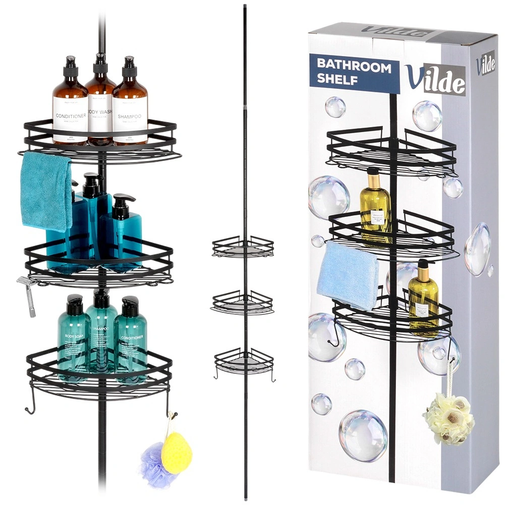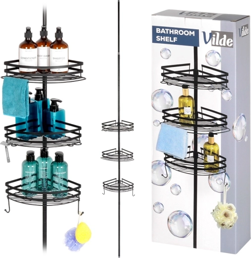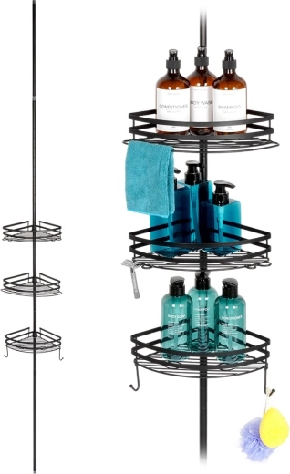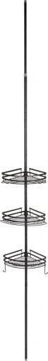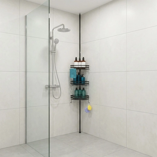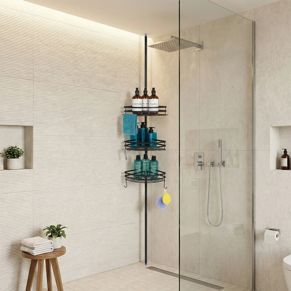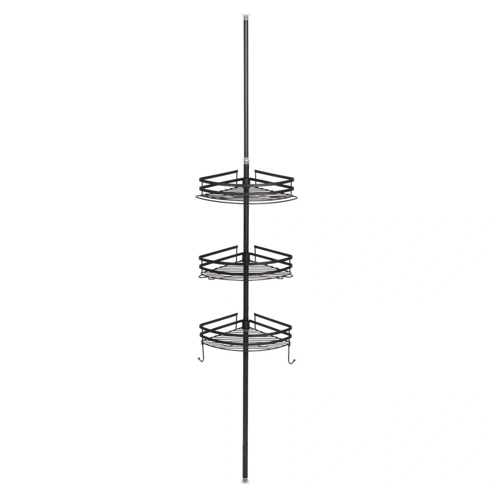 Praktyczna narożna półka prysznicowa z teleskopowym drążkiem rozporowym bez wiercenia oferuje 3 przestronne koszyki na szampony i kosmetyki. Trwała w całości metalowa konstrukcja w matowej czerni, regulowana wysokość oraz szybki odpływ wody dzięki drucianemu dnu zapewnią porządek i suchość pod prysznicem i nad wanną.