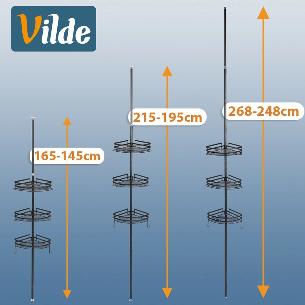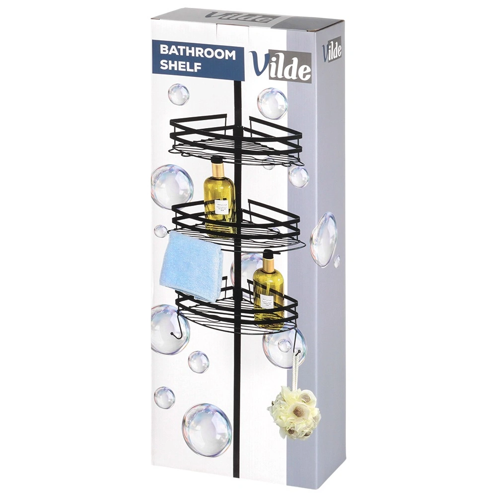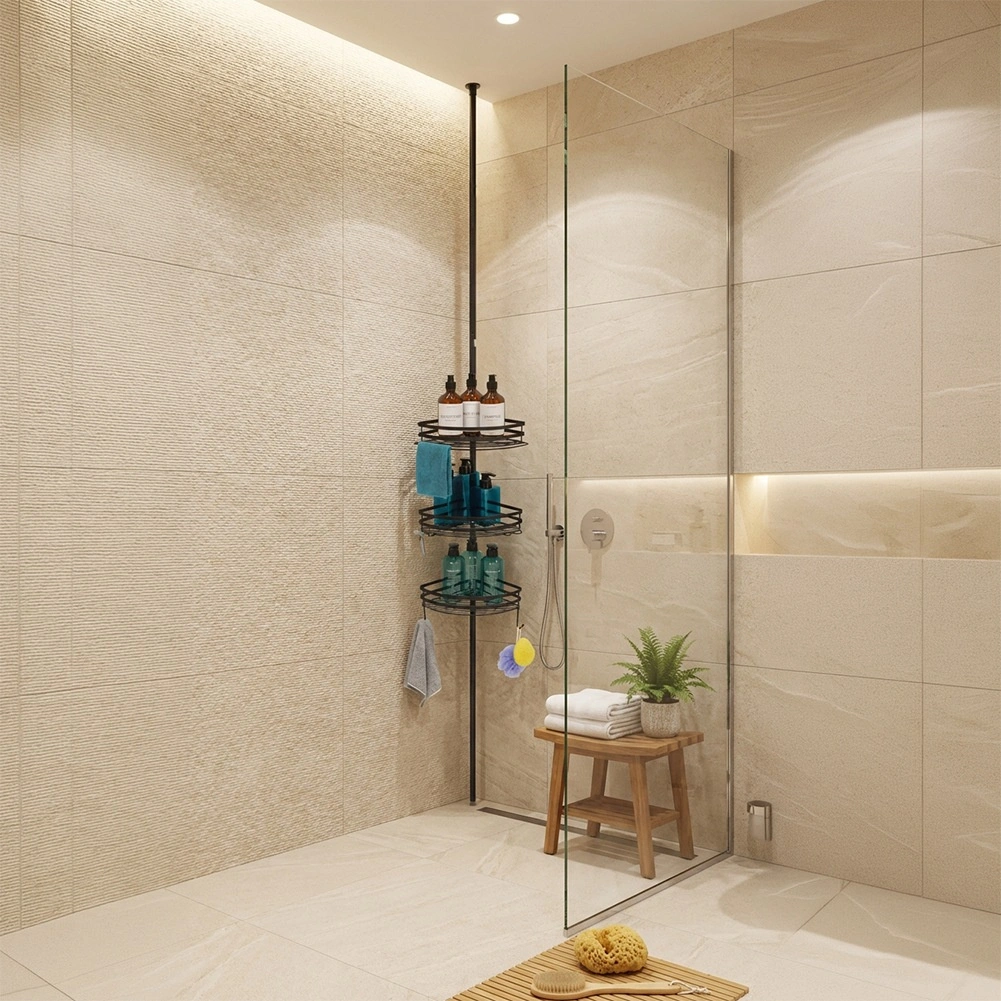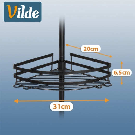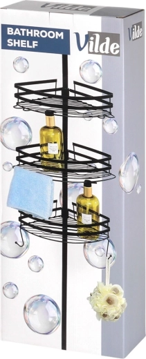 Praktyczna narożna półka prysznicowa z teleskopowym drążkiem rozporowym bez wiercenia oferuje 3 przestronne koszyki na szampony i kosmetyki. Trwała w całości metalowa konstrukcja w matowej czerni, regulowana wysokość oraz szybki odpływ wody dzięki drucianemu dnu zapewnią porządek i suchość pod prysznicem i nad wanną.